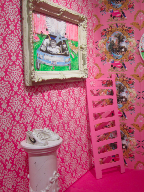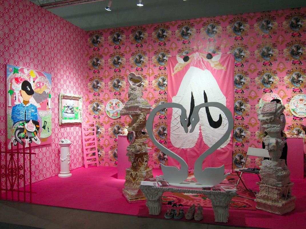 The most thoughtful display, though (and perhaps even the best booth) is that of the Chicago Artists Coalition. The very pink installation by Mexican-American artist Yvette Mayorga is a saccharine but bitter vision of the American dream, featuring Rococo-inspired paintings and sculptures that speak to the traumatic experiences of Mexican immigrants. An ornate, innocent-looking wallpaper reveals repeating figures of ICE agents; a recurring image of a car with a body in its trunk is an unflinching portrayal of how people need to put themselves in danger as they seek better futures. You don’t typically see political work this personal and raw at art fairs, much less by young artists of color. Can we get more of this, please?