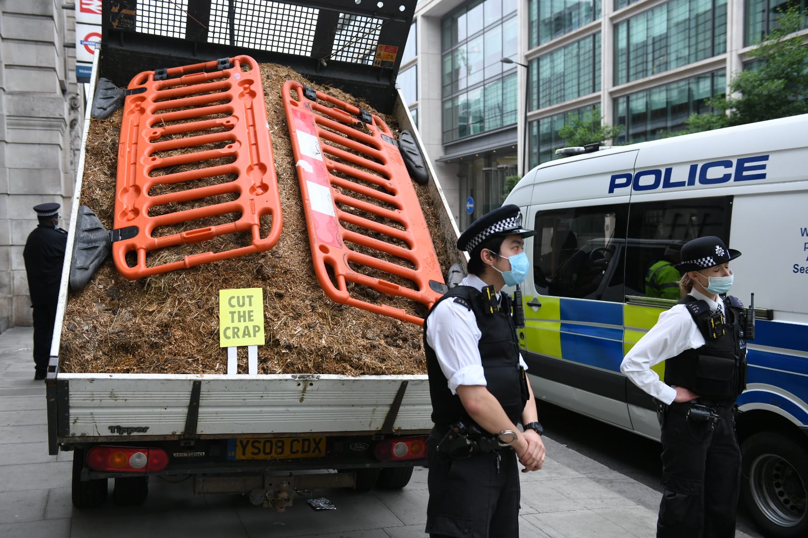 The activists left signs in the manure that read "CUT THE CRAP" and unfolded a banner that read "FREE THE PRESS" at the Daily Mail's headquarters at Northcliffe House in Kensington. A video posted by the group on social media shows the activists being detained and handcuffed immediately after attempting to spray-paint the building around 7am on Sunday. "Our Submission for the 2021 Turner Prize," the group called the action, followed by a winky emoji. Another attempt to empty a truck of manure at the Daily Telegraph offices was halted by police.