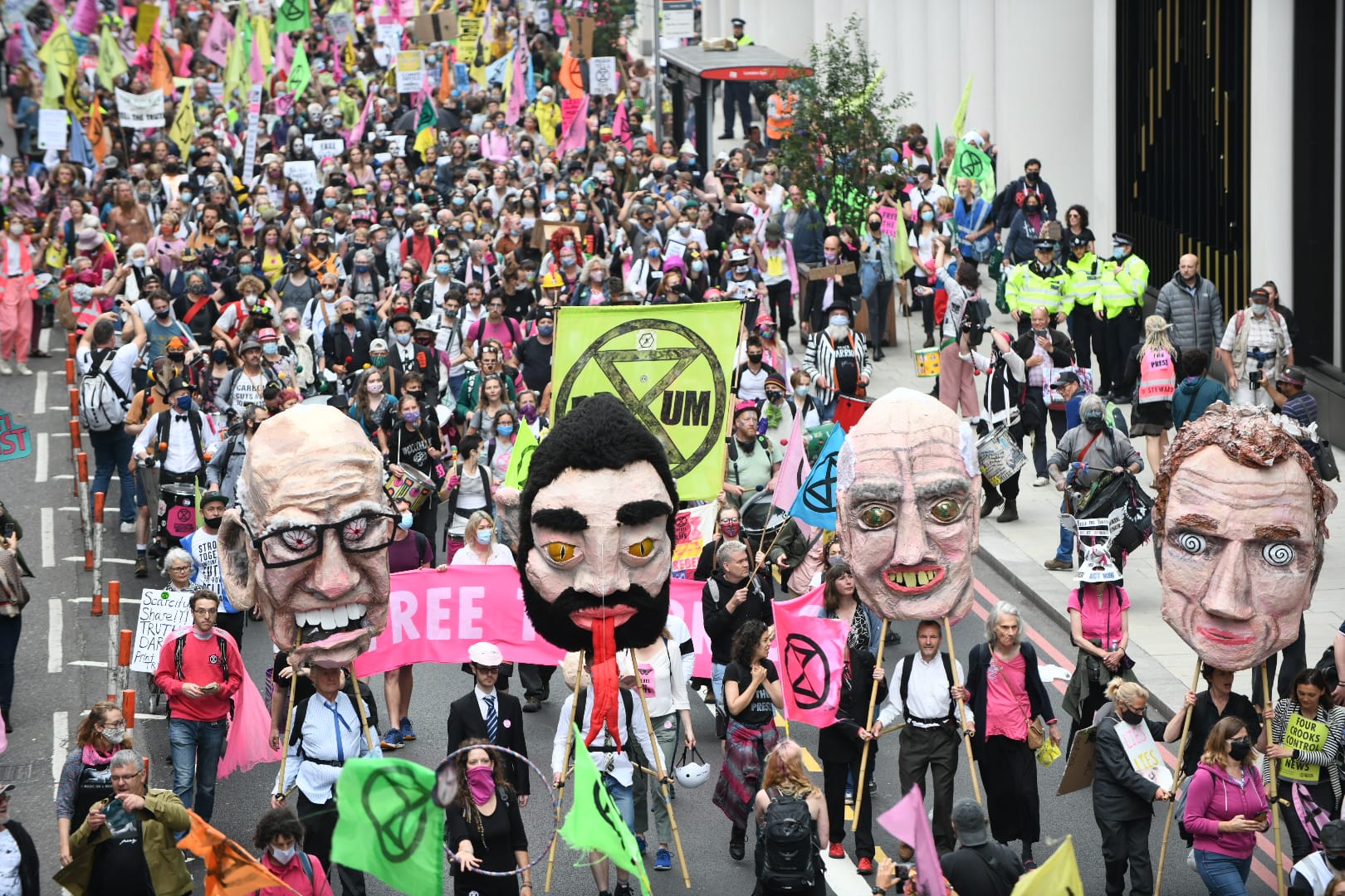 The action followed a police crackdown on the Extinction Rebellion Art Factory earlier that week. The east London warehouse is used to make art for the group's actions and supports Black Lives Matter, nurses groups, and other protestors. A dozen activists were arrested in the raid on Friday, June 25, and a bamboo structure that used in the group's blockade of print media outlets in September last year was seized, according to the police.