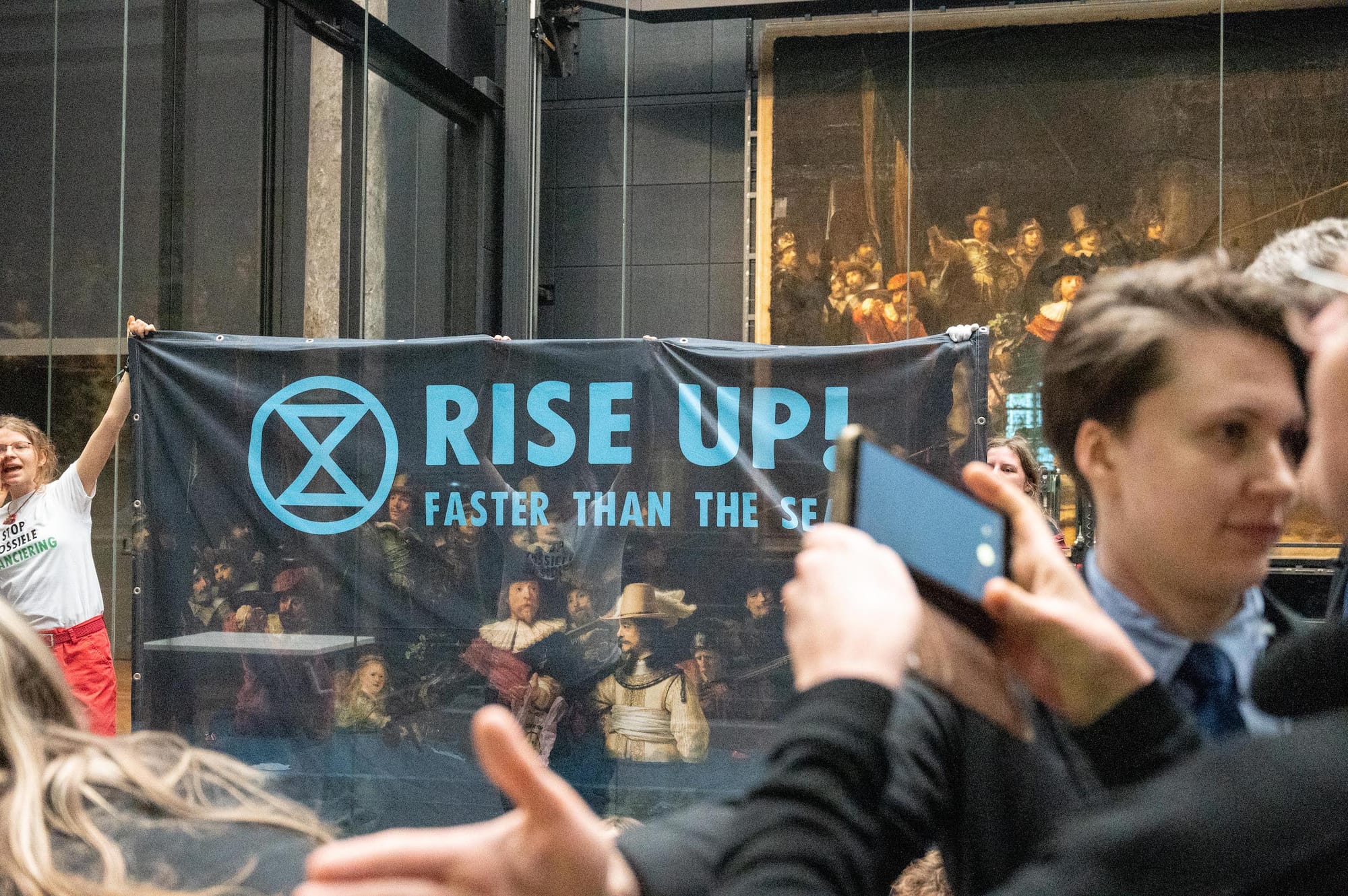 On Sunday afternoon, climate activism group Extinction Rebellion's (XR) Netherlands branch used a Rembrandt painting as the springboard for a new demonstration approach at the Rijksmuseum in Amsterdam. In lieu of splattering protected artworks with illicit liquids, XR printed a large banner depicting waist-deep floodwater in Rembrandt's "The Night Watch" (1642) in front of the original painting, commanding museum visitors to "rise up" faster than the sea.