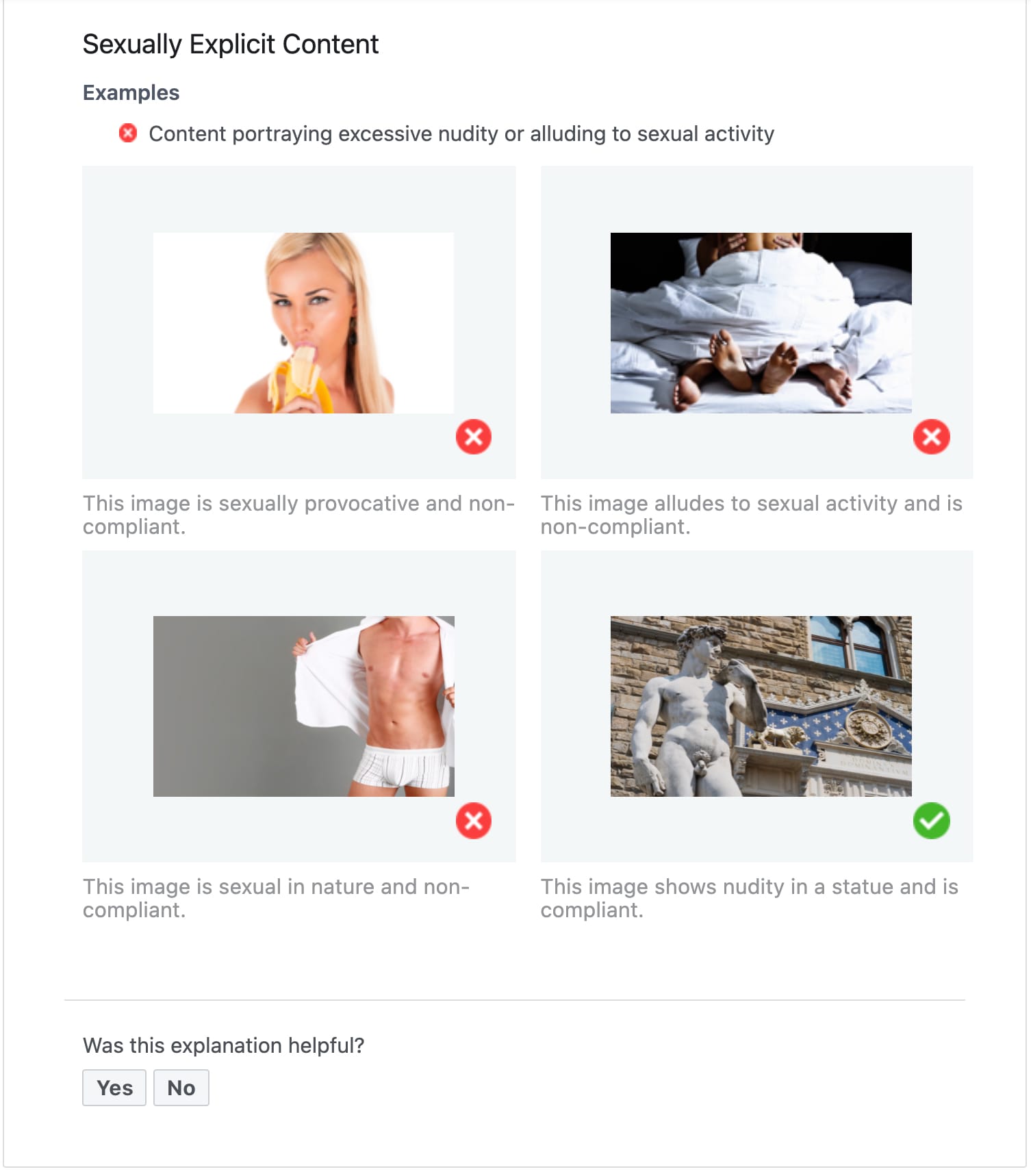 The images deemed unacceptable are classified as such because they either allude to a sexual act (the woman eating a banana), because the pose is overly sexy (the woman reclining on the bed), or because there is simply too much flesh available to the eye (the guy showing off his abs). An exception is made for the fully nude sculpture of David by Michelangelo, presumably because it is a work of art. “This image shows nudity in a statue and is compliant,” the caption explains.