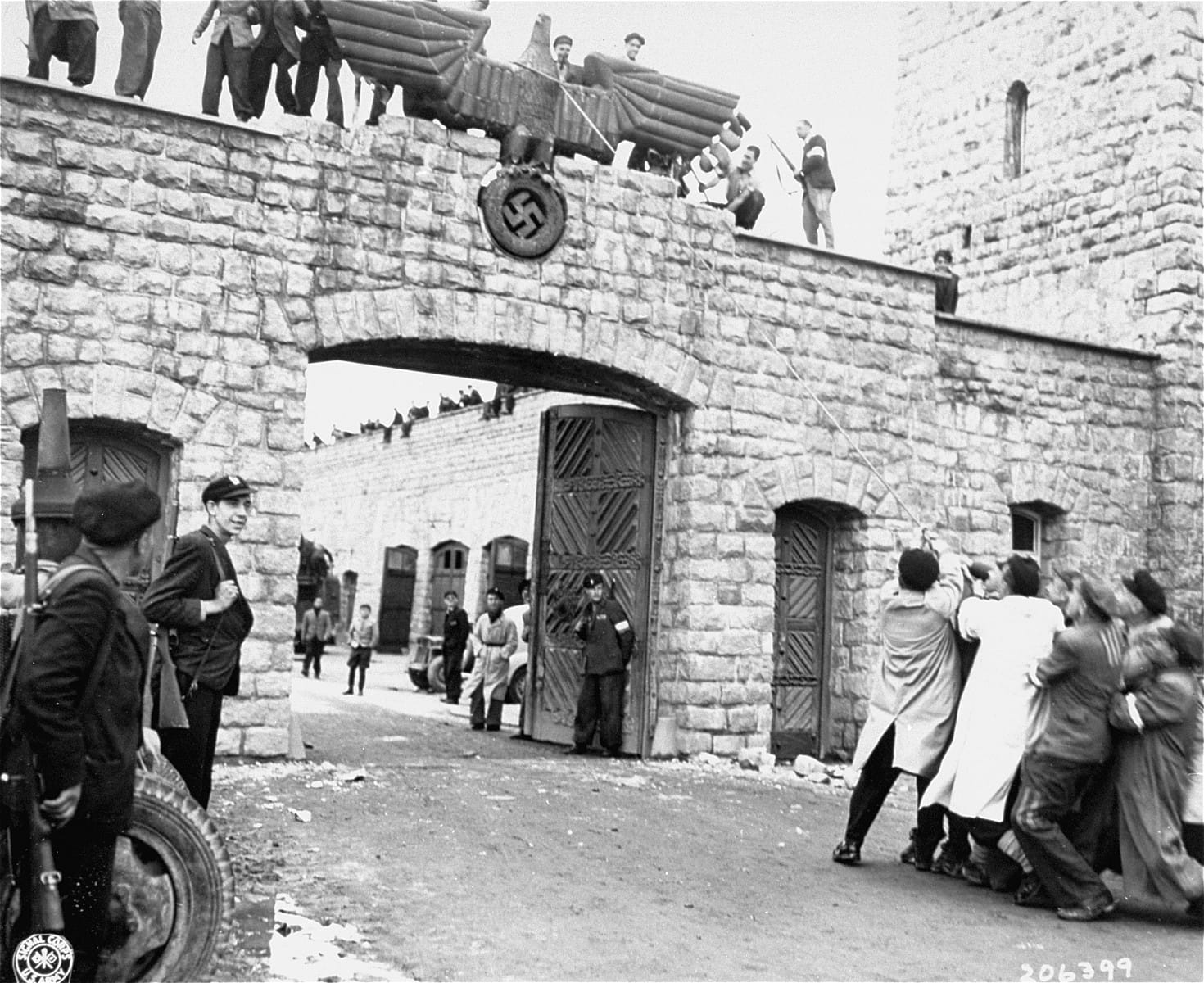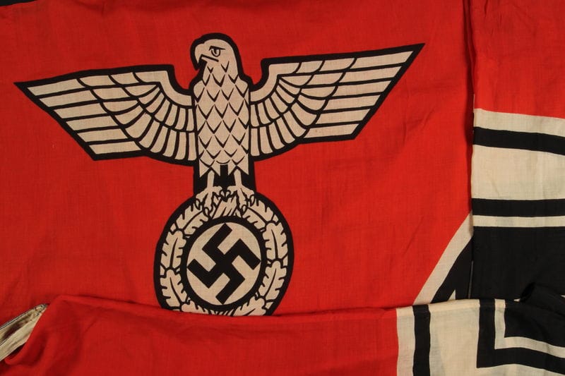 Thus, it comes as no surprise that Hitler ensured the eagle would be changed at the birth of the Third Reich. The new symbol of Nazi Germany was a brutalist, stylized emblem clutching a wreath with a swastika in it. Importantly, when used as the official emblem of the Nazi Party, known as the Parteiadler (Party Eagle), the eagle’s head was turned to its left, ostensibly facing to the East, the “geographic target of the movement.” The same emblem with the head facing right was used throughout the Reich. The German army adopted the Parteiadler shortly after, and both versions figured prominently on all manner of Nazi flags, awards, and other paraphernalia. This symbol, which during Weimar was intended to unify, watched over the Holocaust and crimes against humanity across Europe.