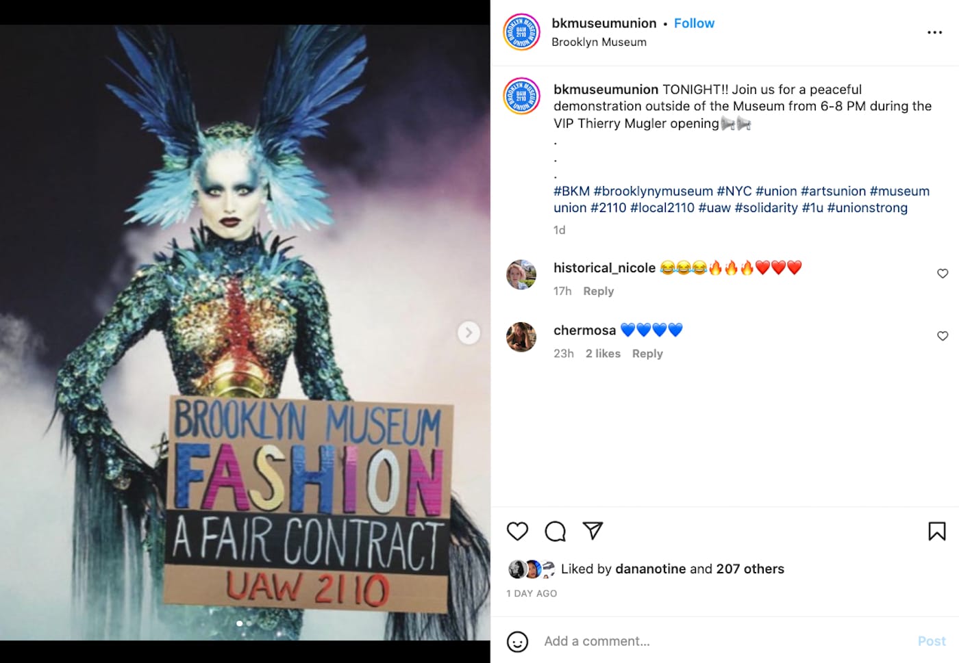 The Brooklyn Museum union's banner announcing the demonstration (screenshot Valentina Di Liscia/Hyperallergic via Instagram)
