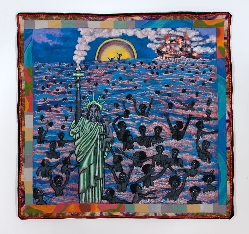 In a work from a later series, The American Collection, a dreadlocked Statue of Liberty cradles a Black baby in one arm and holds up her flaming torch with the other. Around her, dozens of slaves flail in the sea, drowning, while the ship that transported them burns in the background. “We came to America” is the title of Faith Ringgold’s painting — a damning portrait of the land of the free.