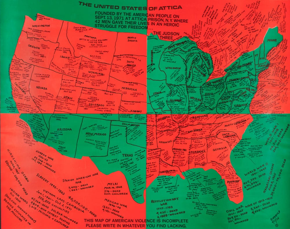 Times have changed. Black and female artists are more visible than ever before. And Ringgold, once an art world outsider, now has works in the collections of MoMA, the Guggenheim, and gratifyingly — the Whitney. The second room in the Serpentine’s showcases some of her activist pieces, such as the Feminist Series — impressionistic landscapes with quotes by feminist icons, which she painted on unstretched canvas so that they would be easy to transport and exhibit. Nearby are a selection of her political posters, including her famous map piece, “The United States of Attica” (1972). Printed in red and green, it shows the death tolls of different American wars and conflicts, creating a harrowing picture of the country’s violent history.
