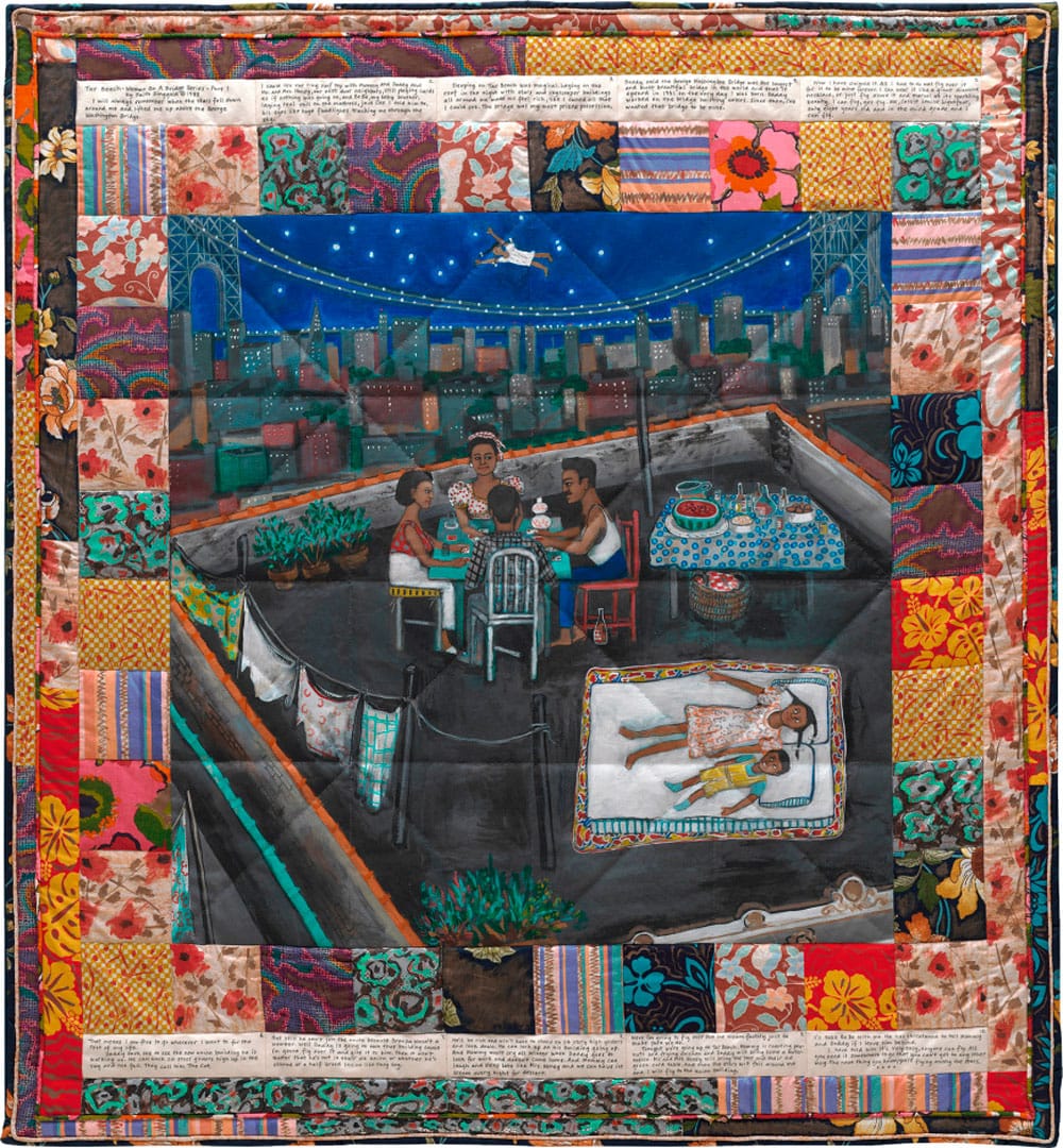 Ringgold’s “story quilts” — painted on canvas with colorful fabric borders — are a vibrant celebration of everyday African American life. “Woman on a Bridge #1 of 5: Tar Beach” (1988), which the artist later turned into a children’s book, is an ode to the summer nights she spent on a rooftop in Harlem as a child, gazing up at the star-studded sky. Other quilts depict a jazz band mid-song and a bustling graffitied subway platform.