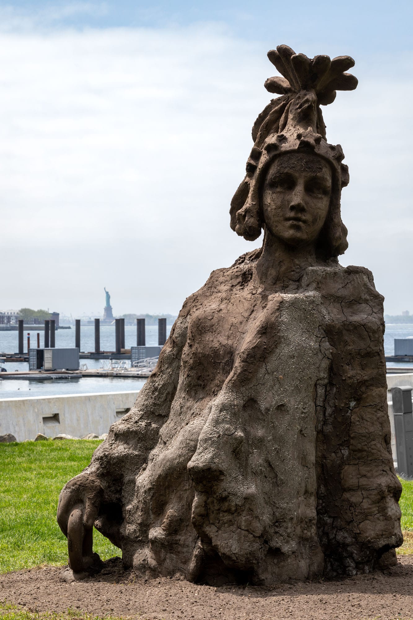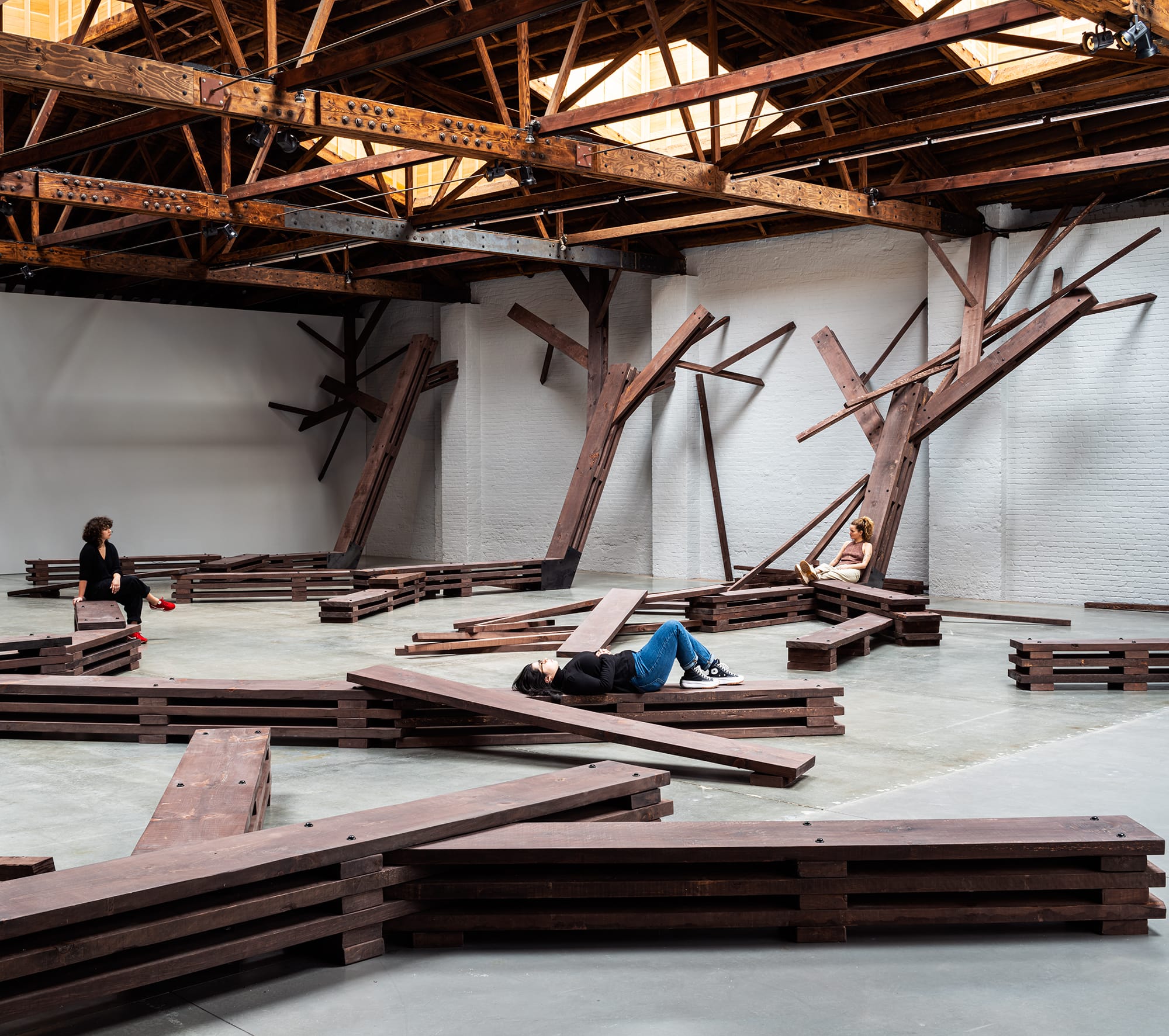 In site-responsive sculptures along the Brooklyn waterfront, five artists explore multivalent visions of Blackness and diasporic identities linked to legacies of the transatlantic slave trade. Sculptor and co-curator Hugh Hayden displays a beached ship evoking a whale carcass, while Kiyan Williams offers a crumbling earthen monument.