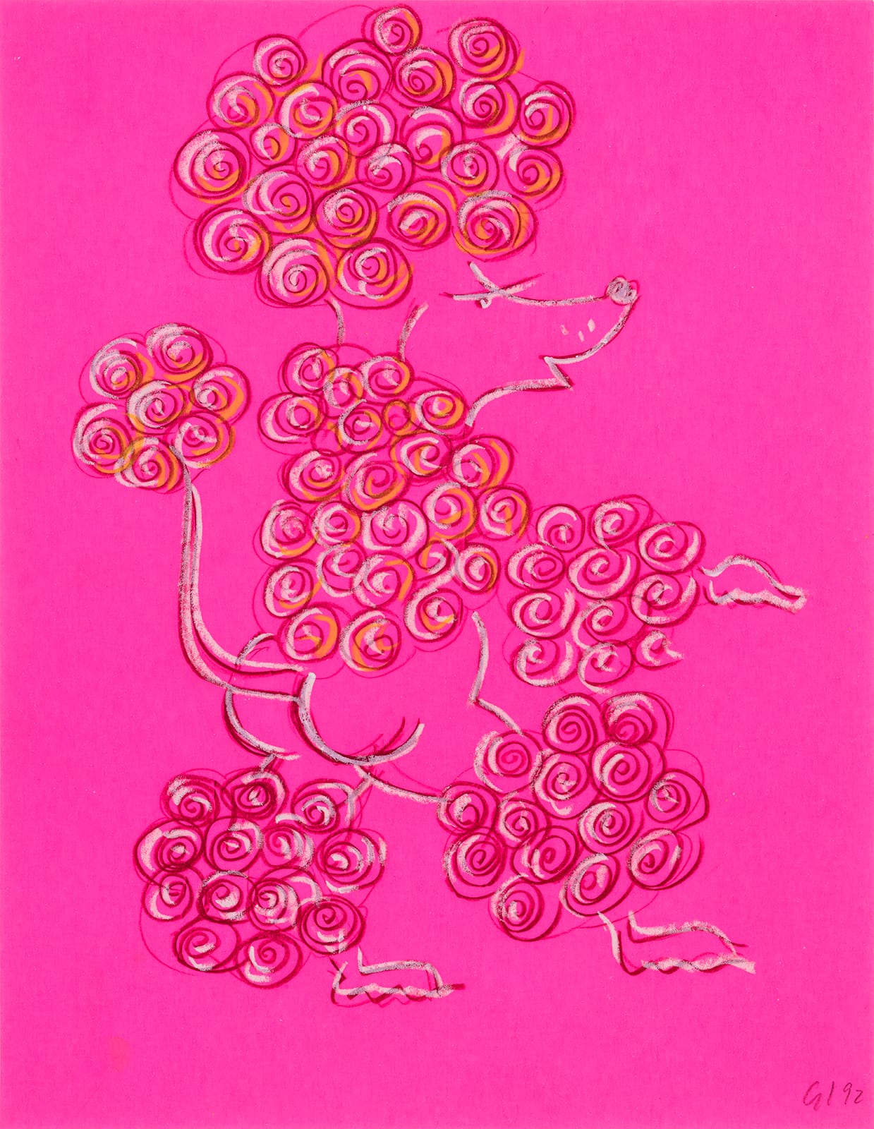 Founded in Toronto in the late 1960s by AA Bronson, Felix Partz, and Jorge Zontal, General Idea was a collective guided by a radical queer politics and a performative orientation. Drawings executed in the spirit of mass reproduction between 1985 and 1993 spotlight motifs like poodles, stilettos, and masks.
