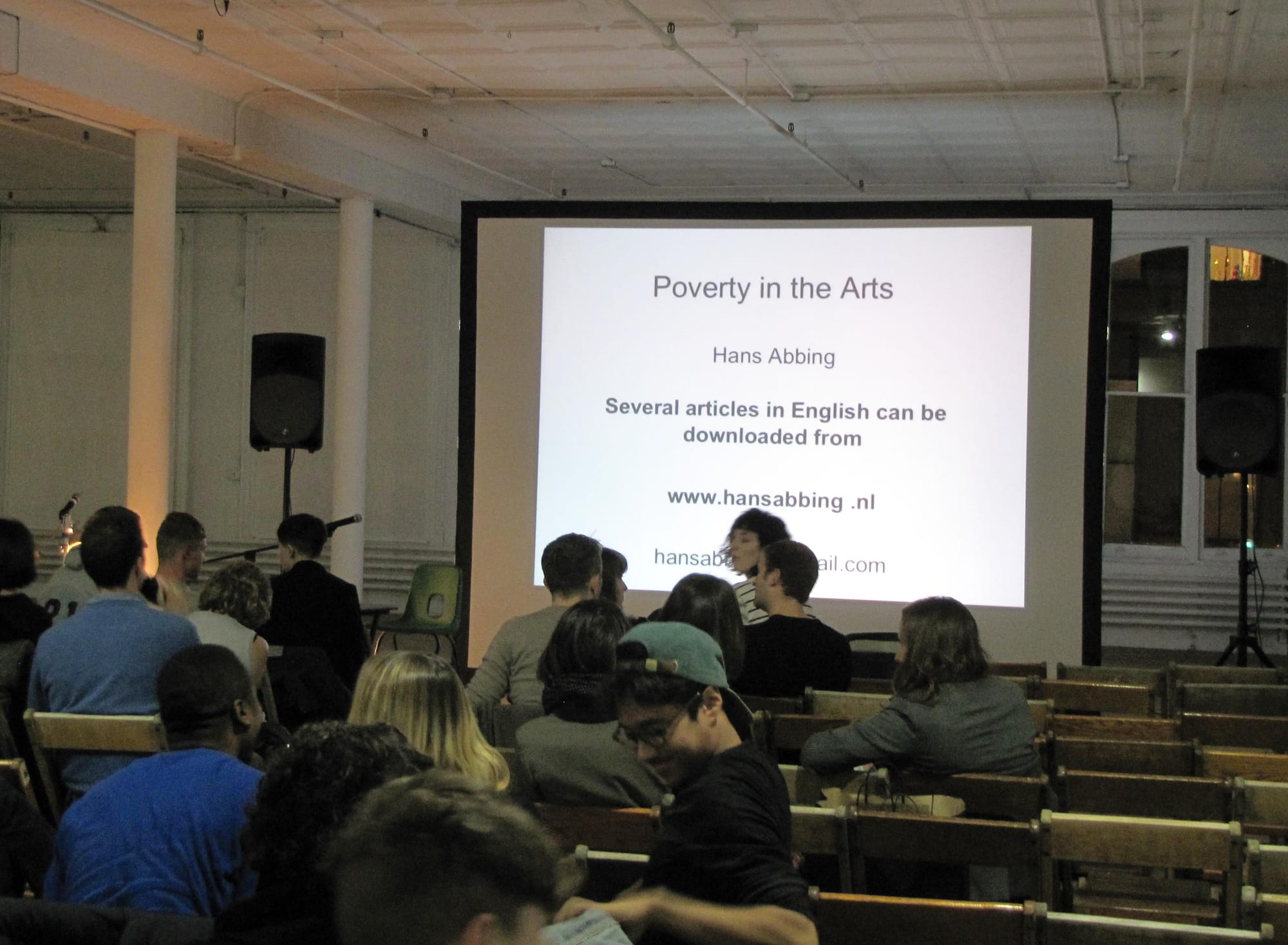 There is nothing more provocative than a civil rights question. We all get fired up. In fact, before the talk began I overheard the person sitting on my left explaining Abbing’s theoretical and economical analysis to his friend as ‘If you give poor people food they will breed, and if you give artists money there will be more artists.”