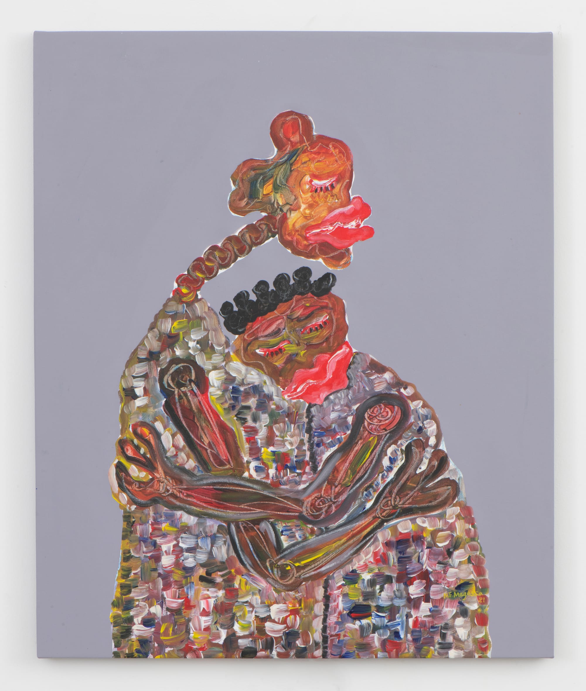 Yet Magassa is uninterested in overly moralizing. Much like the Kôrêdugaw — a secret society of Malian performance artists who preserve cultural knowledge — he points to the contradictions, absurdity, and spontaneity that make life so rich. Just as the Kôrêdugaw instill wisdom through levity, Magassa combines myth-making with a youthful humor, resulting in expressive scenes of joy and anguish — and often both at once.