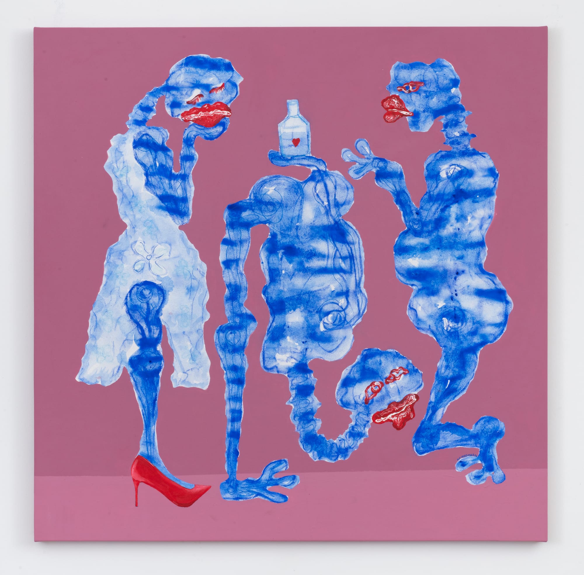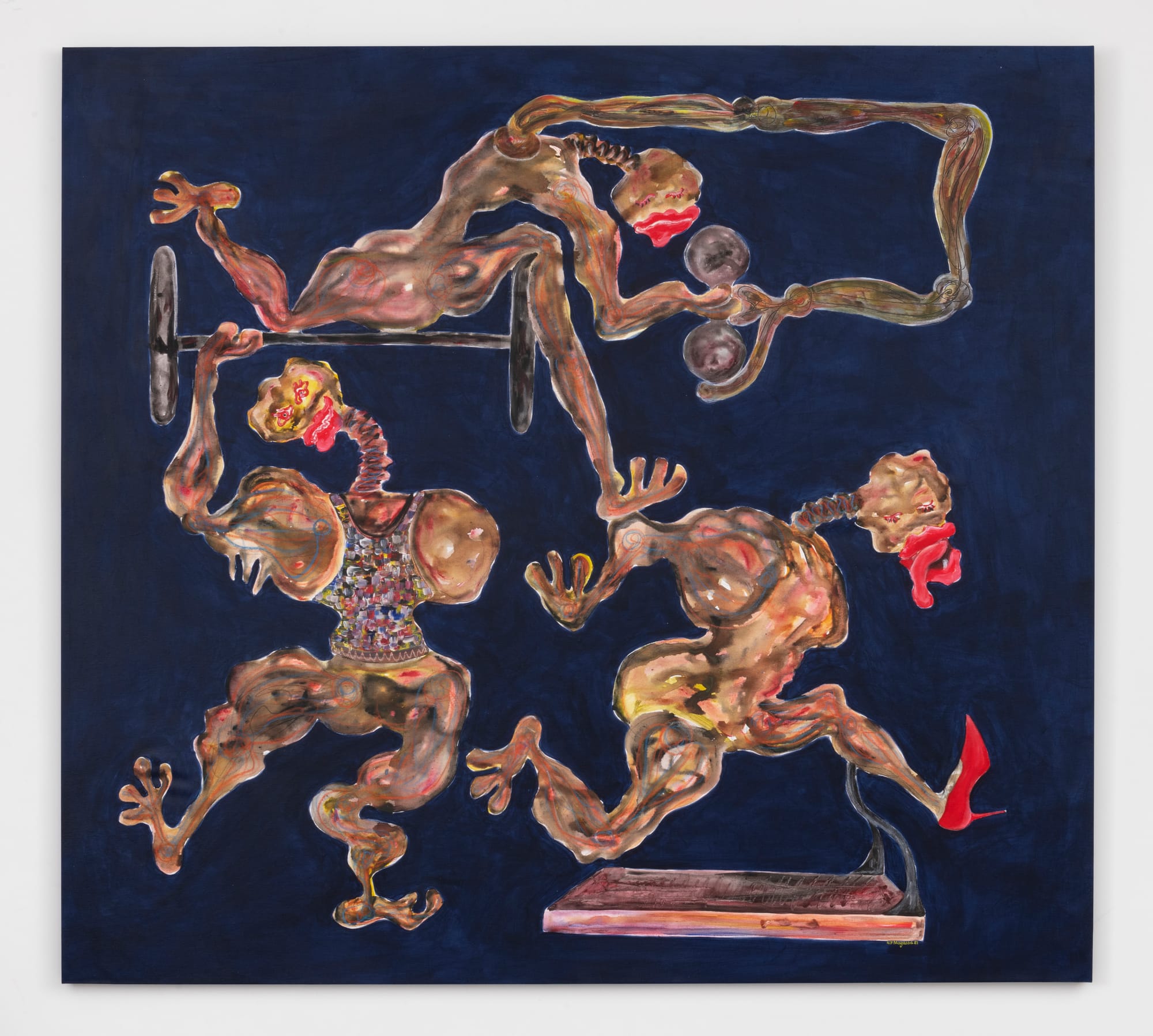 Many of these works speak to Magassa’s cross-cultural experience in France and Mali, the latter of which is 95-percent Muslim. His dark-skinned, full-lipped subjects are shown wearing only one shoe or in the process of losing them, hinting at the stigma of disreputability associated with Shaitan. The presence of this motif correlates with acts of homoeroticism and sex work, yet Magassa absolves his subjects from condemnation. In the exercise scene, one figure is shown with a single red stiletto running out of the frame, and based on the context, one may assume she is training for self-preservation or survival.