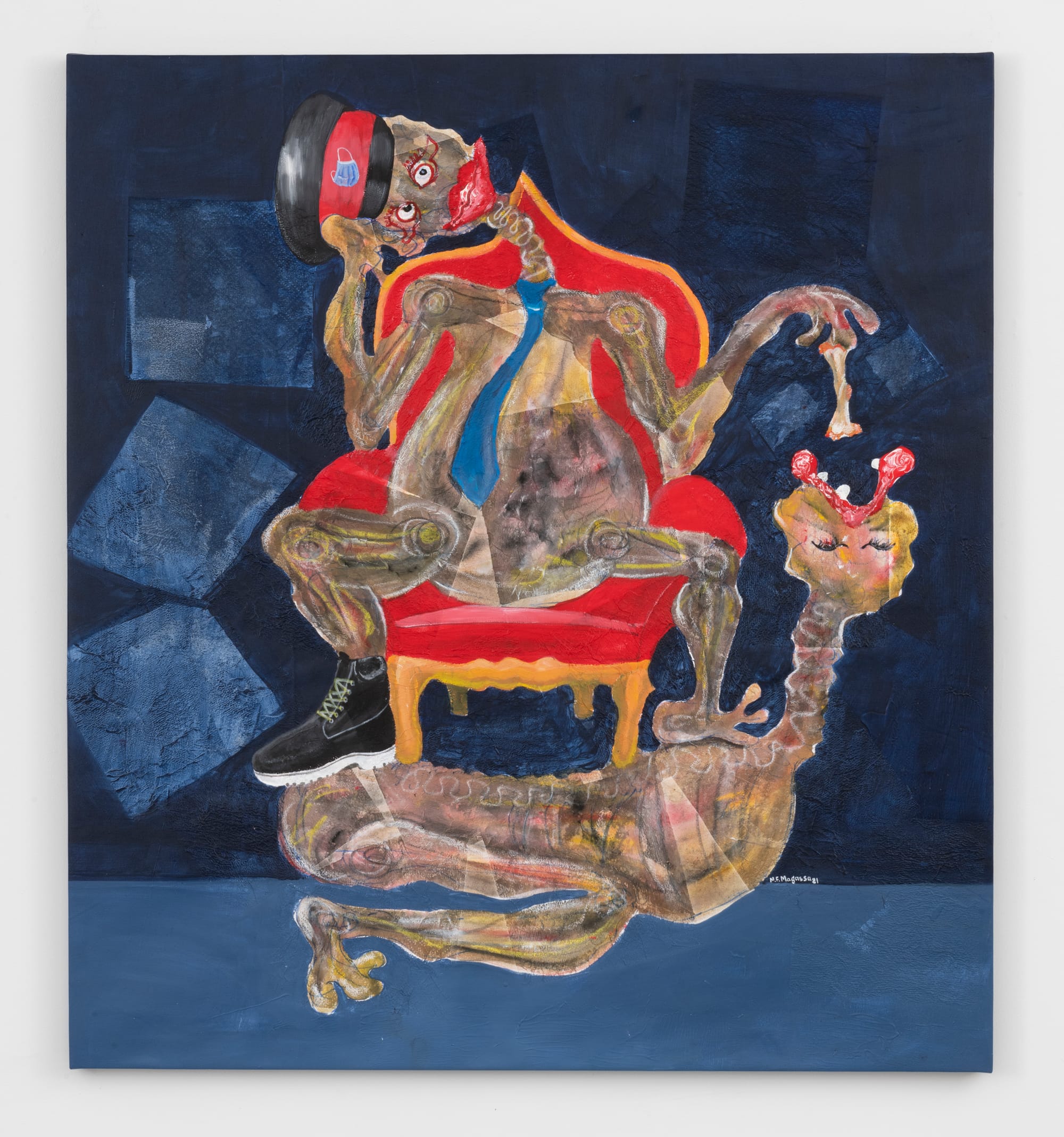 In “Soif Lubrique” (2021), Malian painter Famakan Magassa portrays two lovers in a scene of sexual frustration. From opposite ends of an empty bed, a bald man lunges toward a gray-haired woman, who turns away with her hand raised. The bulky earth tones of Magassa’s nude subjects match an oversized shoe in the bottom corner, evoking the Muslim symbol of undesirability. The artist thus turns a scene of “lustful thirst” into an allegory of ridicule, set against a deep-blue background that creates the illusion of floating.