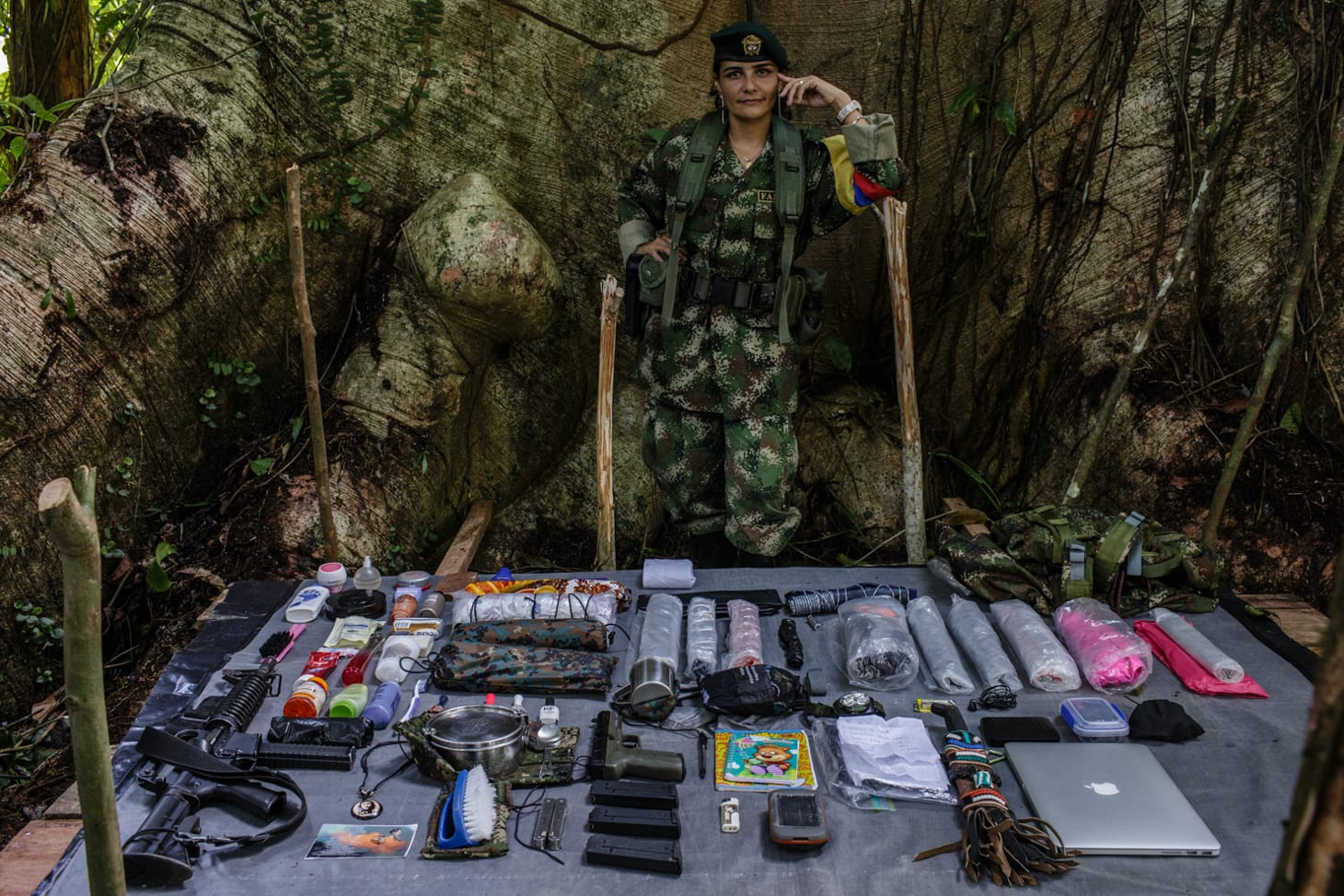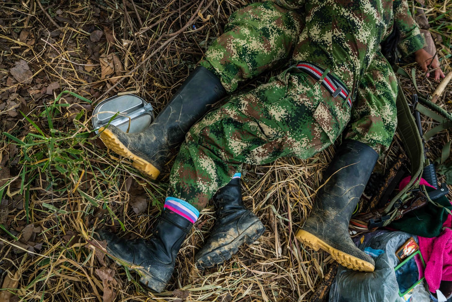 BOGOTÁ — Two pairs of legs, dressed in army camouflage and mud-covered boots, lay entangled on dry grass. In the middle of the Colombian Andean jungle, the couple embraces, their torsos and faces escaping the frame. Scattered to the side of their bodies are few belongings: a plastic mirror, a framed image of Jesus Christ, a bright pink towel, and an assault rifle.