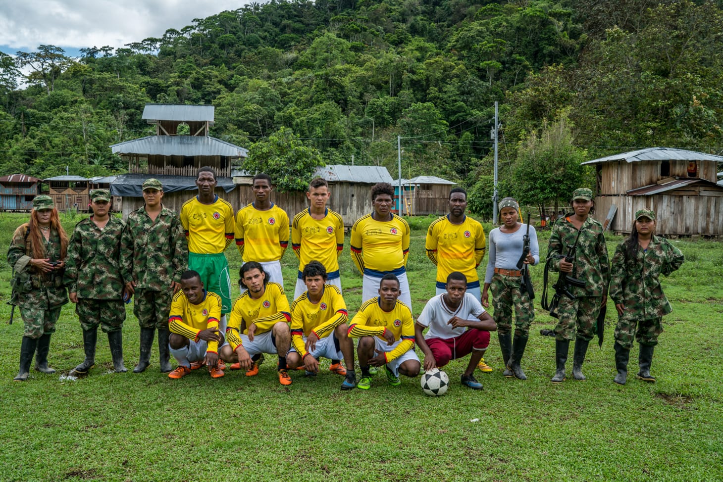 The photographer presents this controversial duality. FARC members interact with locals, sharing smiles and laughs. They play a soccer game. But arms are ubiquitous. Militants receive orders in the early morning, delivered by a higher-up commander in the wading light of the jungle. FARC members, grasping onto their assault guns, stand at the side of the local soccer team.