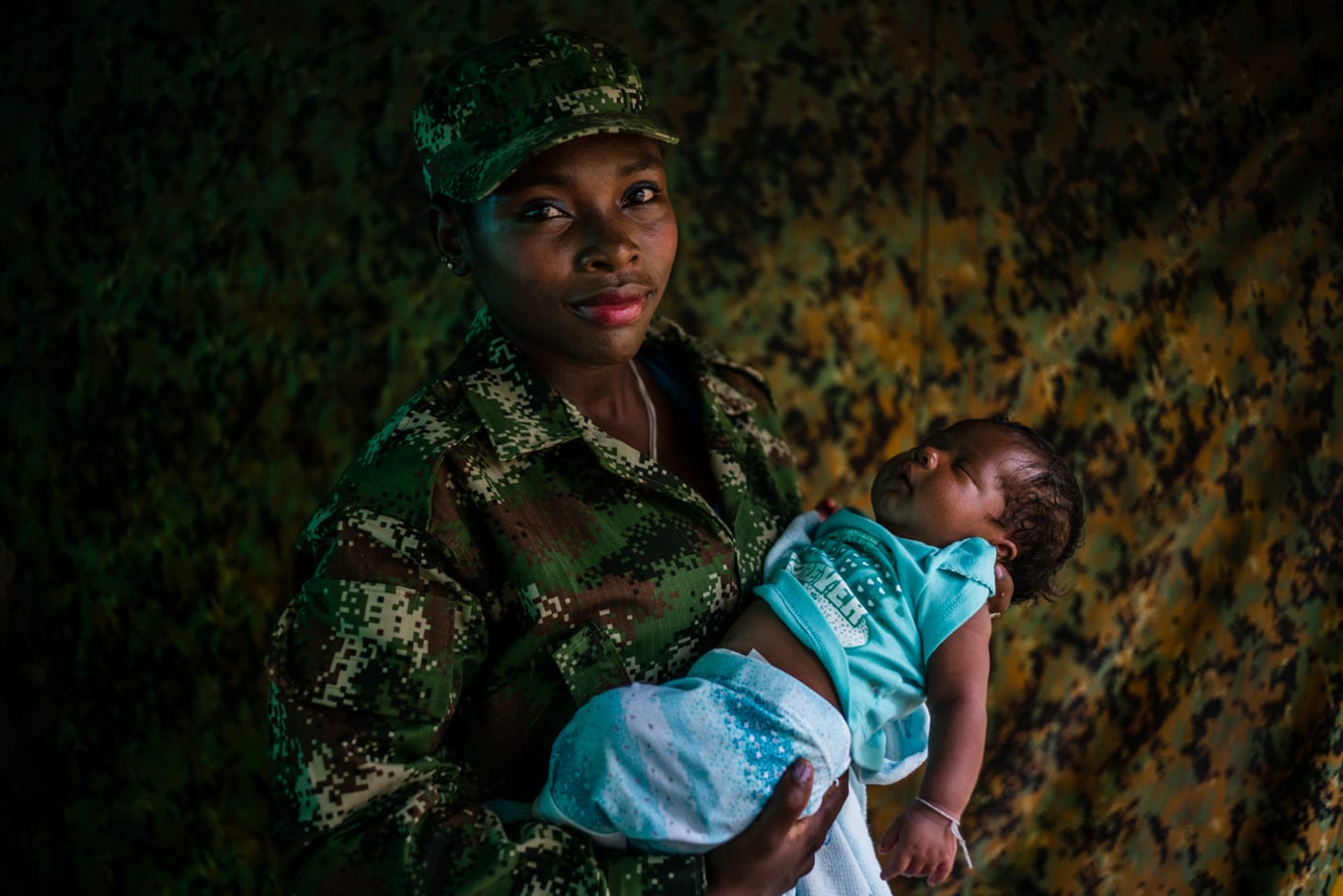 Peering into daily life, Ríos captures routines, love, and intimacy. The series “El Morral de la Revolución” (2016) presents the belongings of twelve members: toothbrushes, photographs, perfume, and guns make up some of the contents. “Chaverra” (2016) portrays a tender moment between a young FARC couple, the image’s subject delivering sweet words to his partner. A portrait of a woman, Vanessa, and her infant daughter Manuela combines two seemingly incompatible existences: warfare and motherhood. After the signing of the peace deal, the FARC loosened its restrictions on pregnancy. The camps saw a minor baby boom, and some FARC members reintegrated into society with their families.
