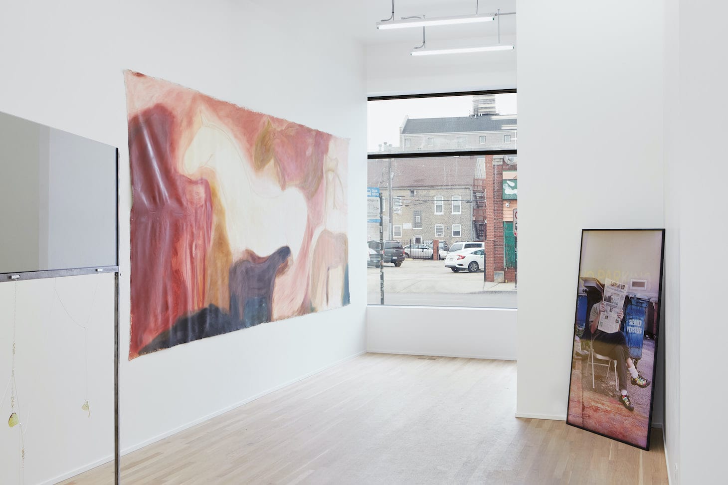 Rachel Schmidhofer’s humorous painting, hi and bye (2018), opens the exhibition. A smiley face waves ambivalently from its frame, evoking the awkward feeling of looking in the mirror too long or posing for a passport photo. Directly to its right, Dominique Knowles’ massive painting “vadhisthana VAM” (2019) depicts a warm scene of horses running, grazing, and a foal nursing from its mothers. A headless, nude human figure sits near the nursing mother. Knowles himself is an equestrian; riding is a trade and sport that necessitates a relationship of mutual respect between horse and rider. In an interview with Bad at Sports, Knowles noted, “You can’t really dominate a horse, but you can ask a horse to do something with you.”