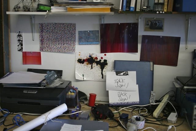 I had a chance to talk with Stearns about how he got started with glitch art, the difference between a glitch and an artifact, and our increasing acceptance of glitches into our homes and lives. Interspersed with our interview are photos from his Bushwick studio.