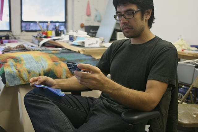 Stearns runs Year of the Glitch, a tumblelog in which he uses modified digital cameras and software processes to create abstract images made up of hazes of pixels. The modified cameras are an outgrowth of “circuit bending,” or the customization of electronics for creative ends. Stearns runs Year of the Glitch, a tumblelog in which he uses modified digital cameras and software processes to create abstract images made up of hazes of pixels. The modified cameras are an outgrowth of “circuit bending,” or the customization of electronics for creative ends. During a recent visit to his studio, open for GO Brooklyn, his shelves were stocked with soldering irons, voltmeters, and textiles printed with the images he created.