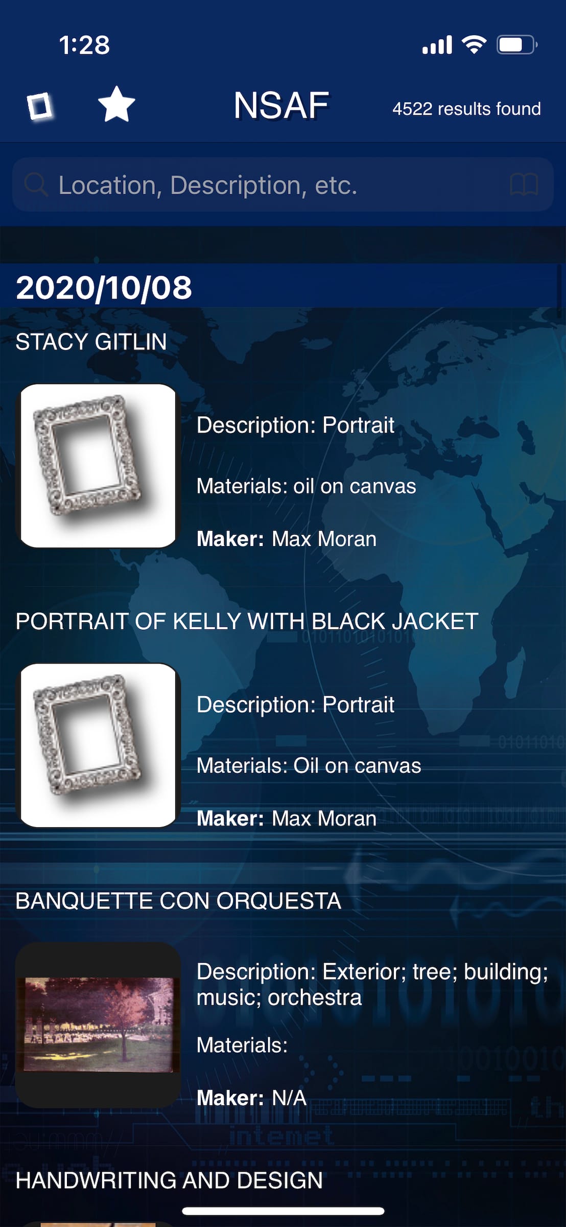The app features 4,522 stolen objects which are searchable by subject matter, medium, or artist. Many of the works are not photographed, and a simple search returns multiple reproductions of a stock photo of an empty silver frame. Users can also navigate through 21 categories ranging from paintings to guns to masks. An "other" category contains a whopping 1,482 objects, many of which could be sorted into actual groupings. For some reason, an entire category is dedicated to the database's two stolen wine coolers, and eight works did not make it into any category at all.