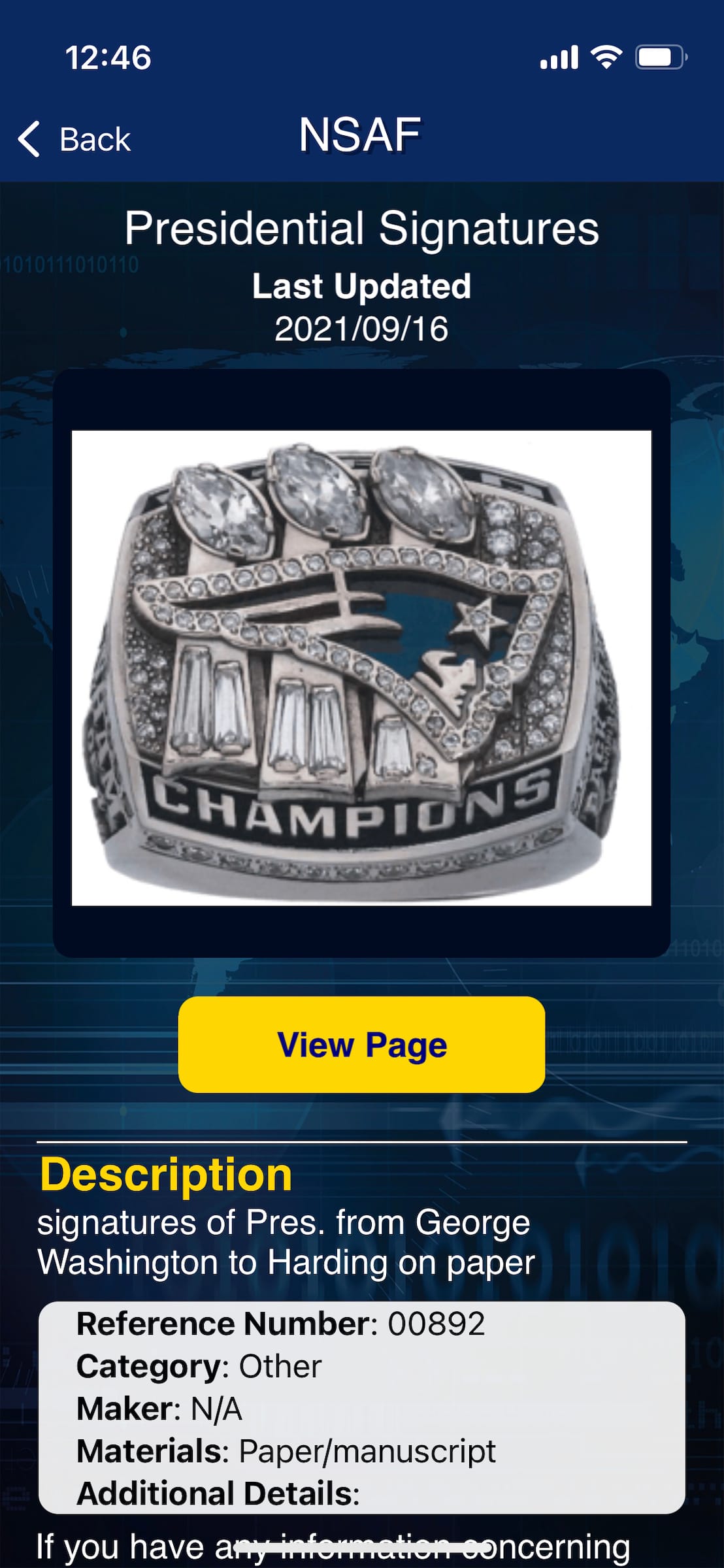In the April 10 announcement, FBI Art Crime agent Colleen Childers said the new program is a push to make the existing database more user-friendly, an aspiration that the app in its current state does not exactly speak to. A search for "George Washington" revealed a New England Patriots Super Bowl ring that was tragically described as "signatures of Pres. from George Washington to Harding on paper," with its medium listed as "manuscript." Further, artist searchers for "Vermeer" and "Manet" — two artists whose work was stolen in the infamous Isabella Stewart Gardner Museum heist — came back empty.