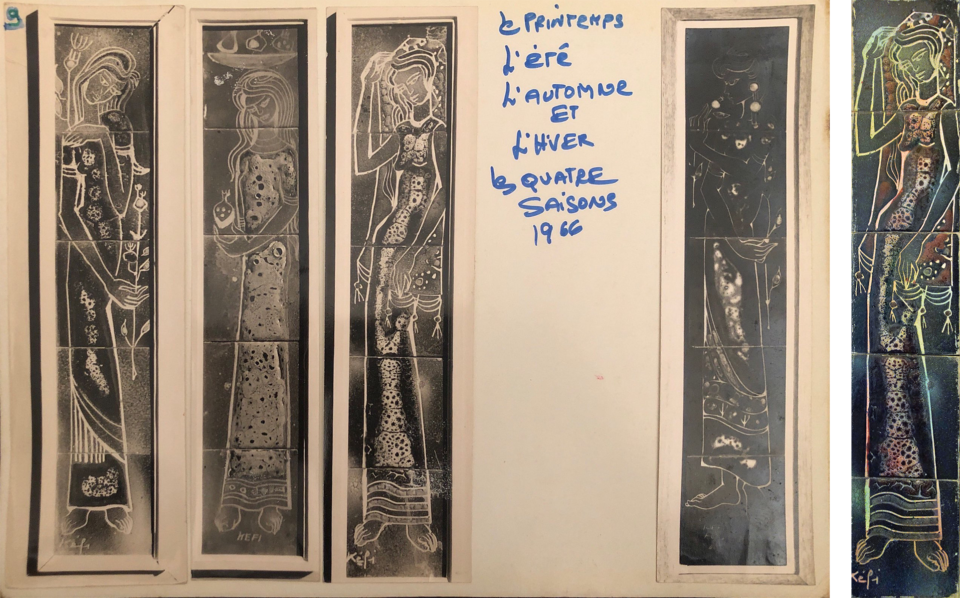 Given this context, I reached out to artist Fela Kefi Leroux to collect her personal testimony of the event and gauge her perception of Blackness. A Tunisian national, she was sent by France in 1966 to Dakar to take part in the contemporary art exhibition Tendencies and Confrontations. At the start of our conversation, she warned me that her memories of the festival were scarce: “The festival was almost 60 years ago, how could I possibly remember details!” Kefi Leroux handed me a thin file she had compiled with her archive of the Dakar festival containing an intact brochure and program of the event and photographs and postcards of her personal collection. In Dakar, the artist presented three ceramic-based works, including two panels from her Four Seasons series (1966). Her ceramic practice at that time echoed the call of the Tunisian artistic movement École de Tunis to incorporate local craft techniques into fine arts practices. Kefi Leroux was a student of the renowned artist Abdelaziz Gorgi, who himself belonged to the École de Tunisand taught a ceramics studio in the Tunis School of Fine Arts.