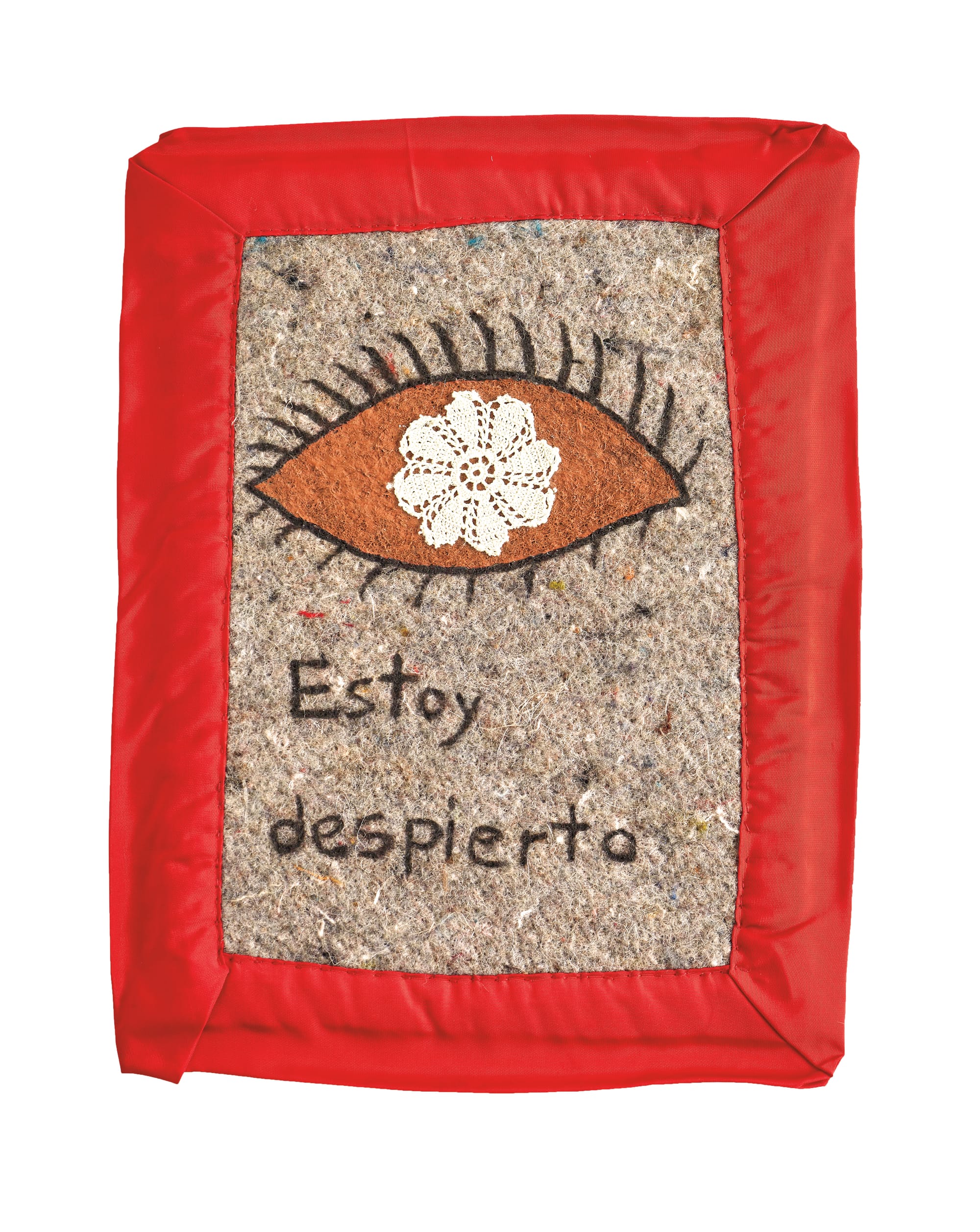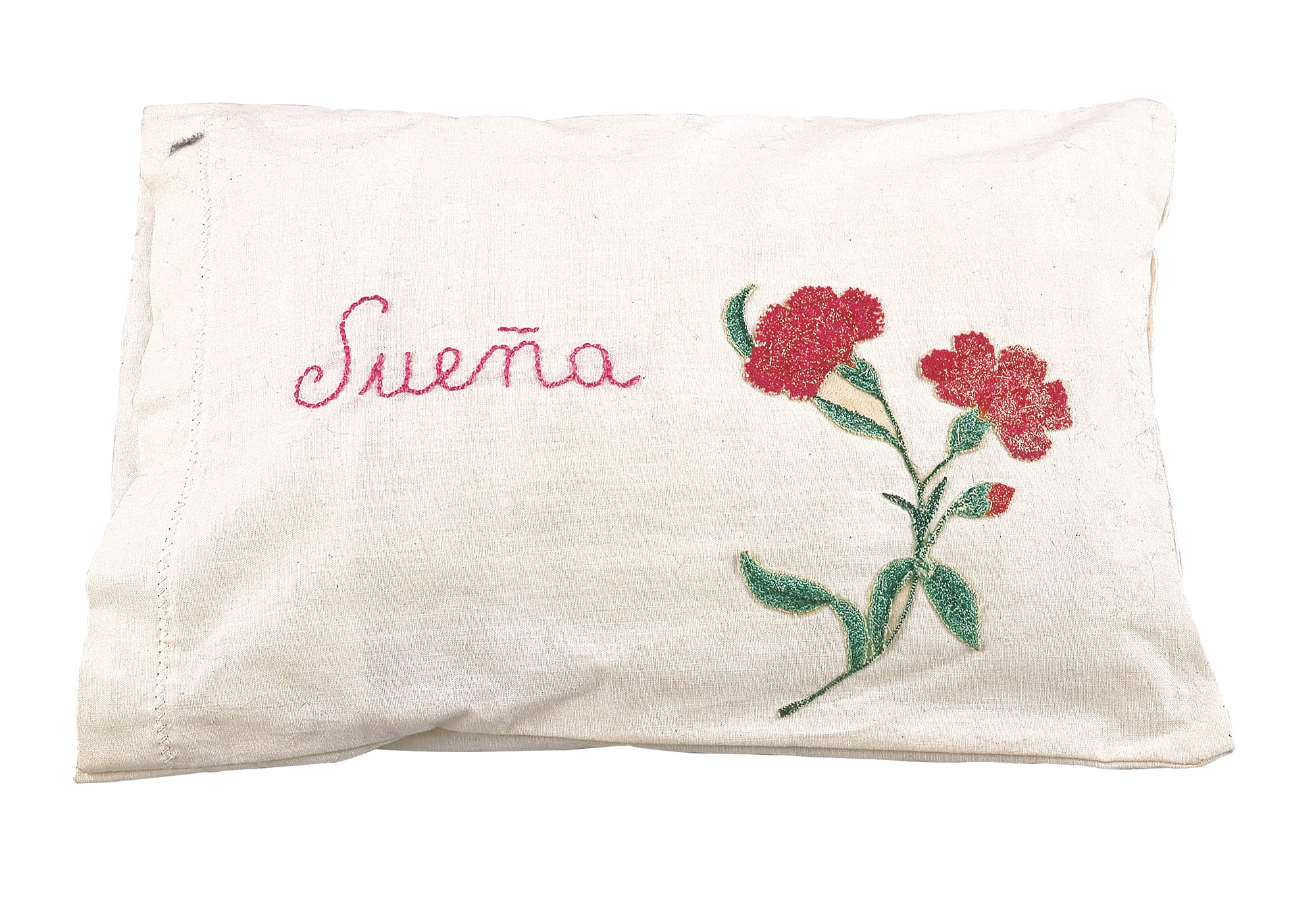 Particularly in his later years as he became bedridden, Centurión used his needles to meticulously embroider short texts or single words onto pillows and small blankets. Intimate, confessional, and sometimes heartbreaking, his words are those of an increasingly sick man with no cure in sight. “Mis globulos rojos aumentan (My red blood cell count increases),” reads one piece with a buoyant yellow trim. “Soy alma en pena (I am a soul in pain),” says another. Three pillows from 1996 simply read “Reposa (Rest)”, “Soledad (Solitude)”, and “Sueña (Dream)”: a tranquil reprieve.