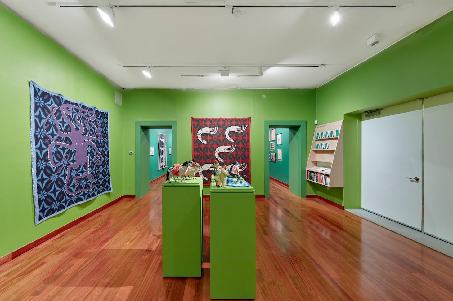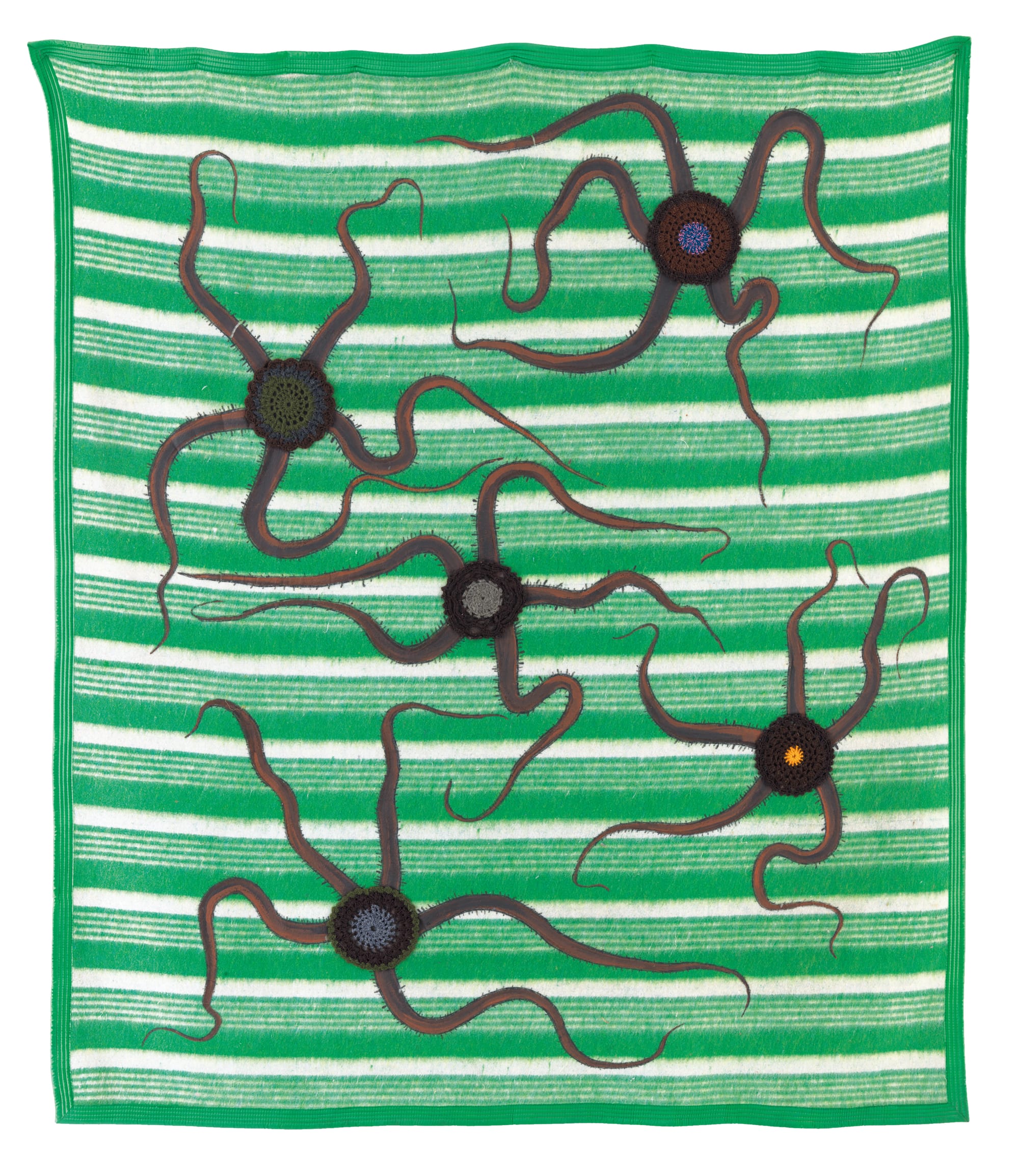 The show opens with some of Centurión’s most explosively joyful works: paintings of subtropical animals on patterned blankets from the fabric district of Buenos Aires, where he relocated in the early 1980s to make art in a less repressive environment. An oversize purple acrylic octopus overtakes its decorative cloth backdrop with a flourish of tentacles; five jellyfish with crocheted doilies at their centers bob in striped green and white fabric. In their large scale, brilliant coloring, and cheekily clashing patterns, these frazada paintings are exercises in exuberance. Underlying that exuberance, however, is a certain tenderness: blankets, like the other domestic textiles that Centurión appropriated, lay close to the body, comforting, sheltering, and embracing it. They are soft, yet emotionally charged objects.