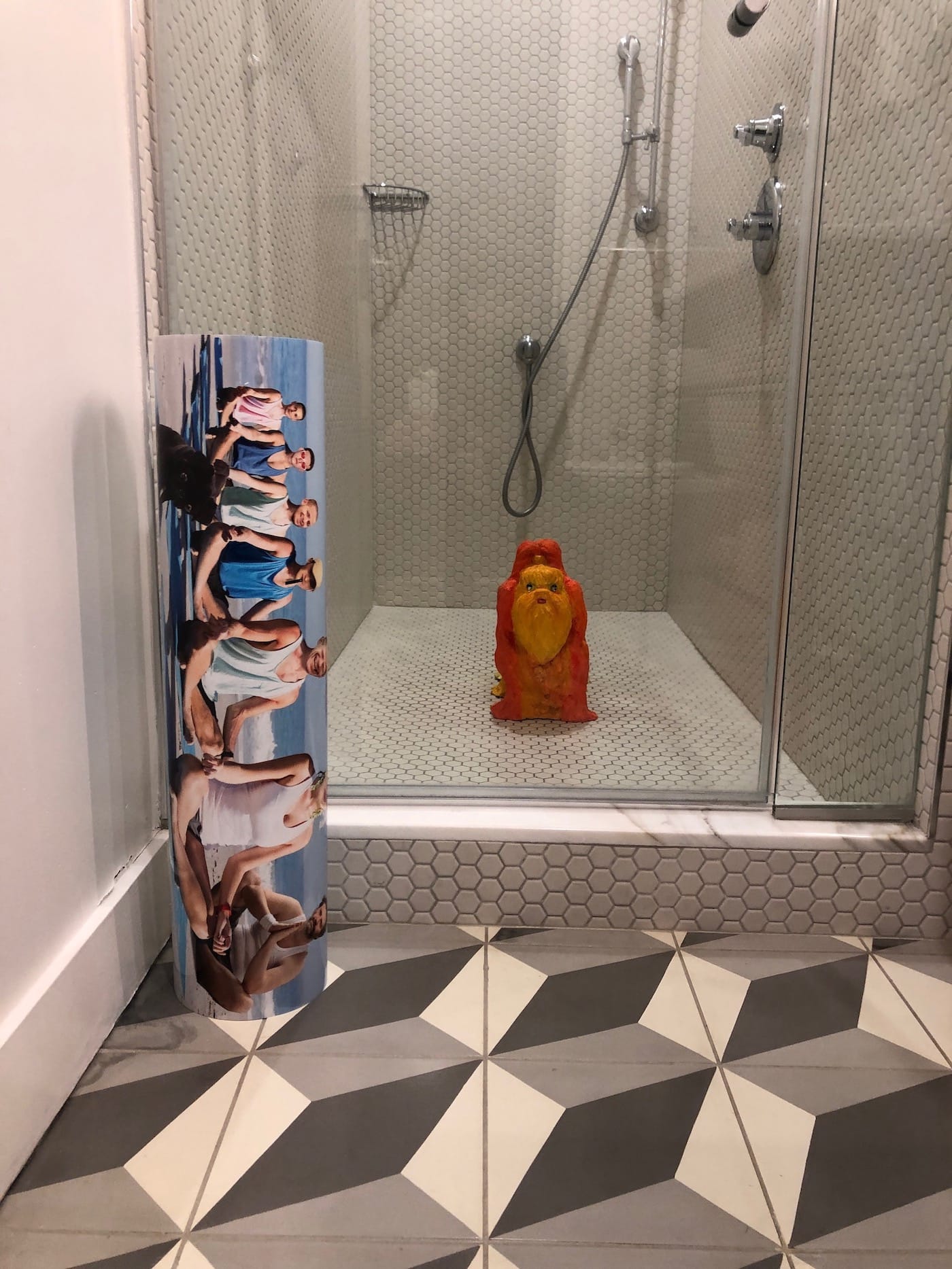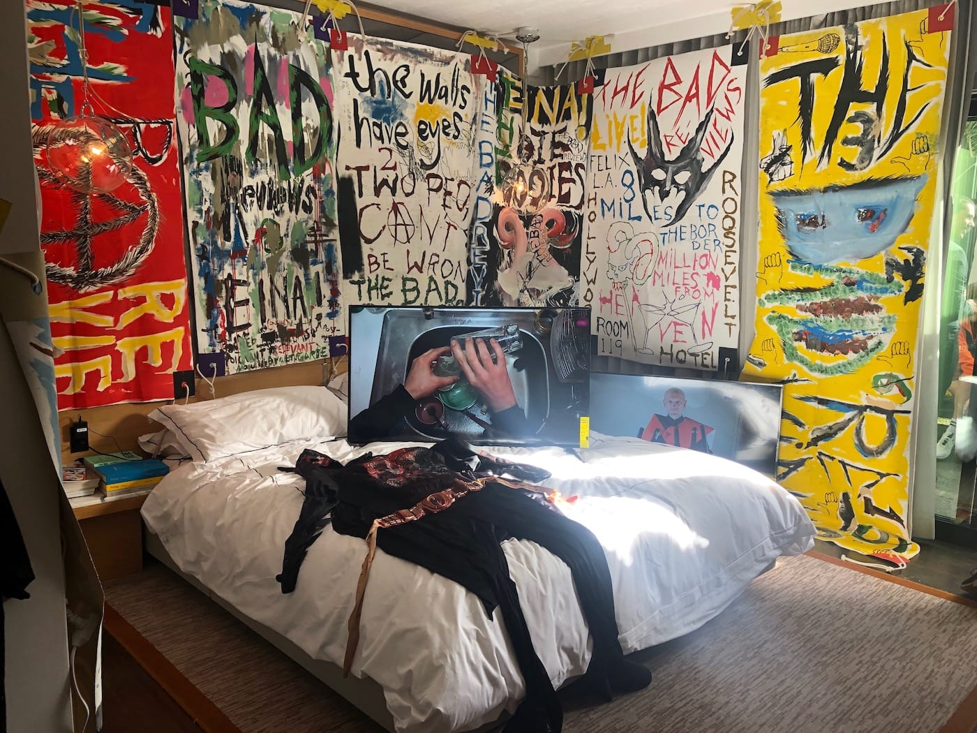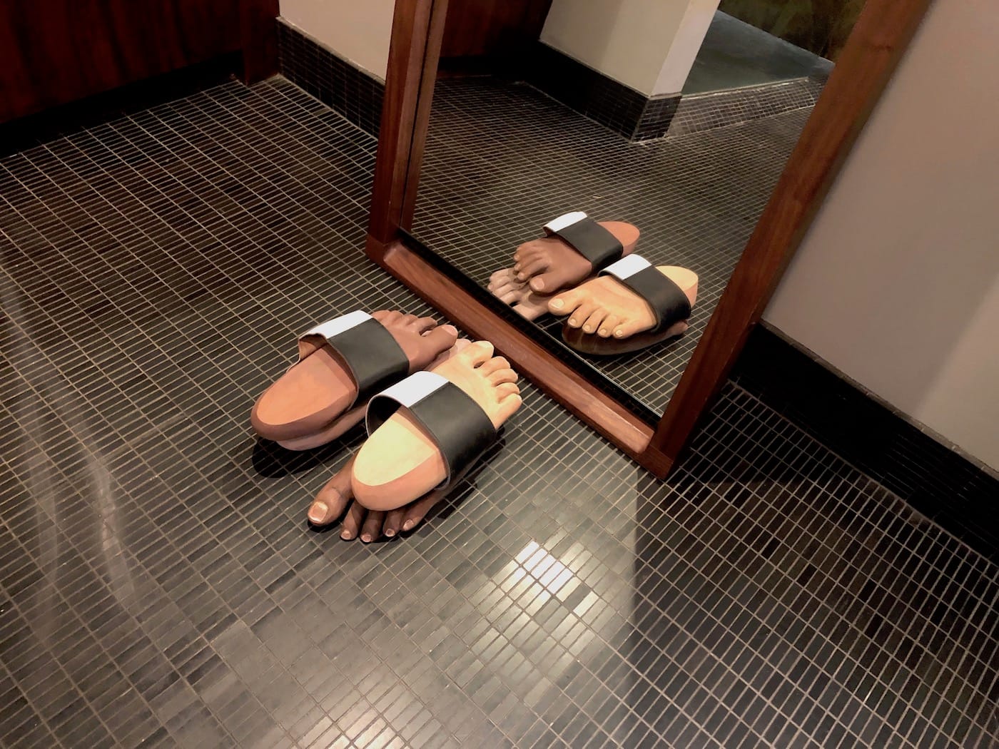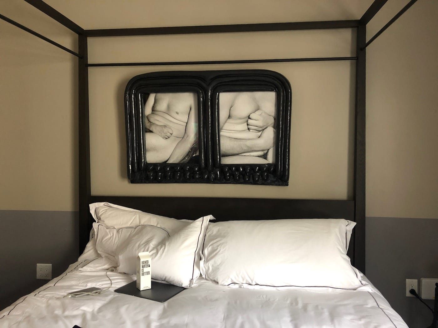 Valentine has said he wanted to eliminate this general commercial feel of art fairs, and, to a certain extent, he did. The hotel rooms do give the possibility of finding something genuinely unexpected in a way temporary white walls never again will, including one moment of sheer delight I had spotting a beautifully strange sculpture of stacked human feet by Mella Jaarsma, placed in front of a floor-length bathroom mirror at Baik + Khneysser. However, there is no way to make concerned or disappointed-looking gallerists (on their cell phones or staring curmudgeonly off into space, respectively) look like anything other than evidence of “transactions” or lack thereof.