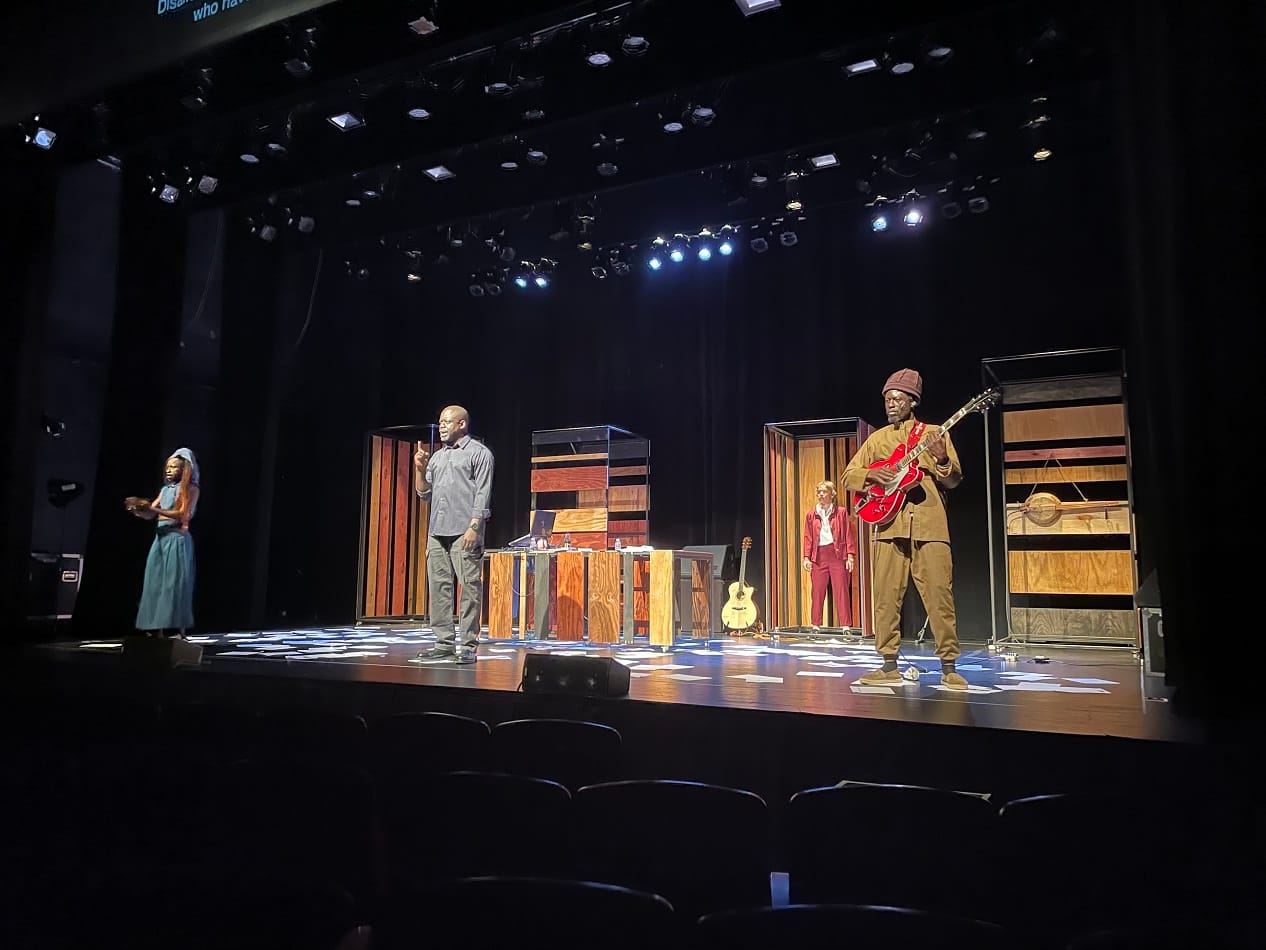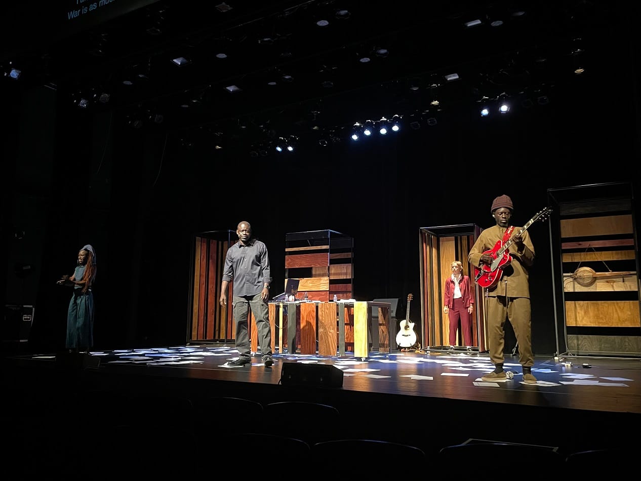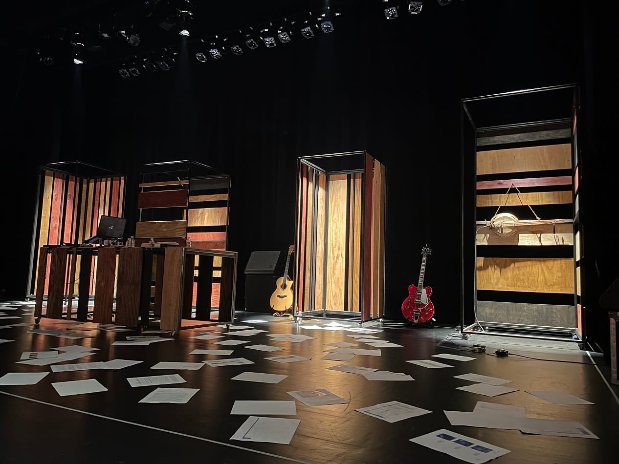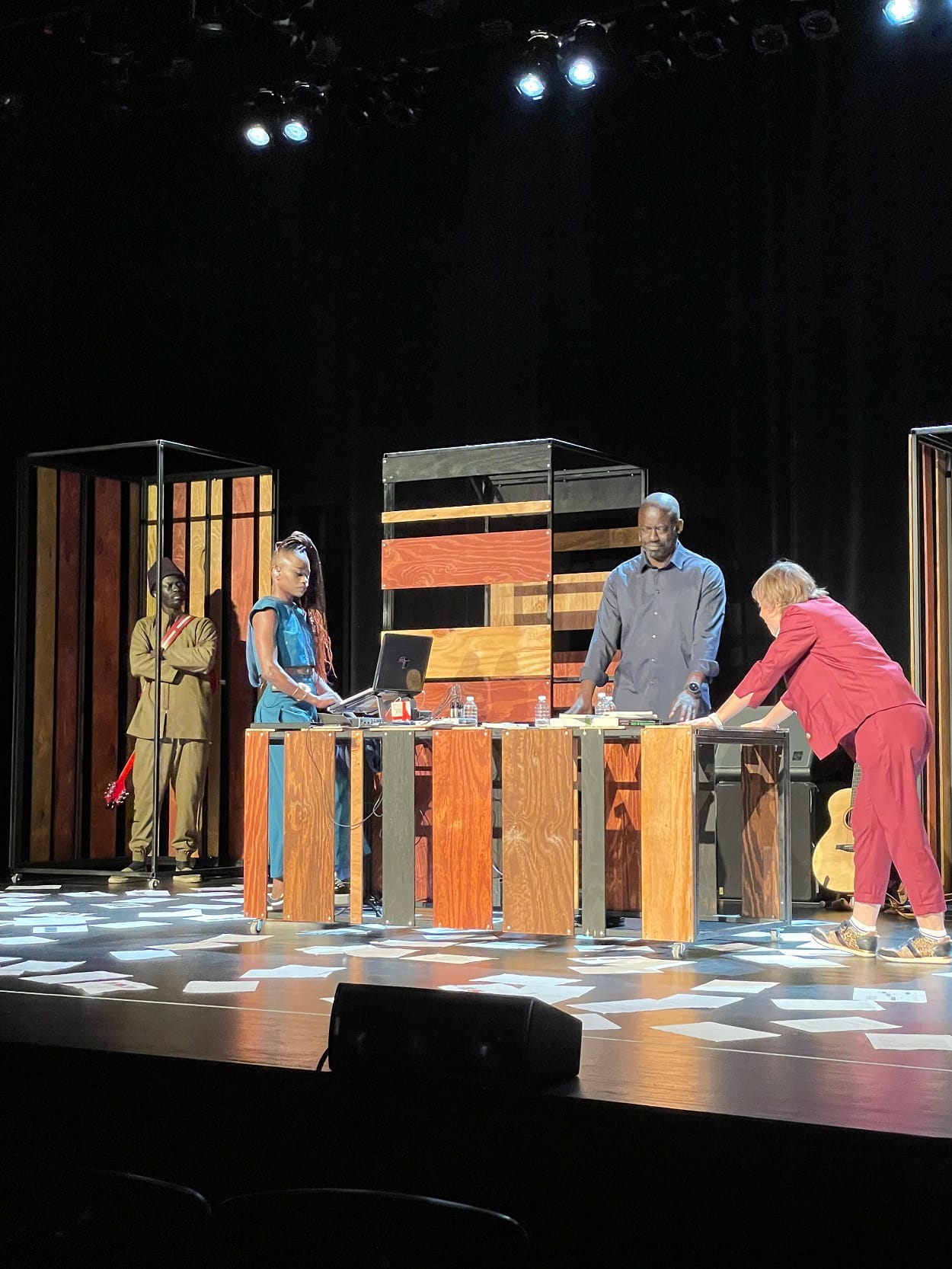 The play, framed as a radio show, opens with a scene of a recording studio with four wooden booths. A table sits in the center holding half-full water bottles, a laptop, and an integrated audio production board. One electric guitar, one acoustic guitar, and one banjo. And scattered all over the floor is a mess of loose-leaf pages. Laure (Marie-Laure Crochant) is interviewing Dj’djack (Felwine Sarr) about his most recent book Richmond Road, following a conversation between poet René Char and political philosopher Frantz Fanon. Though the two minds never met in life, Dj’djack imagines this conversation, as if he’d seen it in a dream, the two of them exchanging ideas in a restaurant.