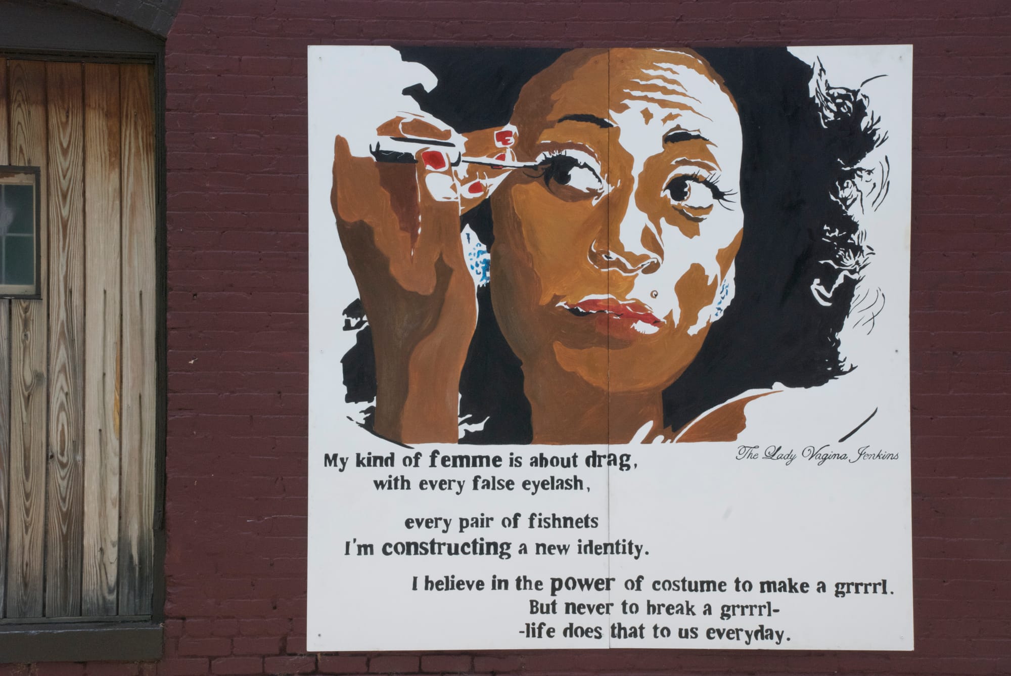 E. Oscar Maynard, who is genderqueer (women-identified with an asterisk, they specify), delves into questions of gender, citizenship, history, and what it means to occupy public space through their work. As their creative practice has evolved, it has involved less spray paint and more paper cutouts. But Maynard lauds how the street and a stencil work as a “portable, contrasty, heavy-hitting medium for a message being in the world in a very particular way.” That “anybody passing by could interact with it” makes street art not only accessible, but also necessary. Their poster Brook Bolen employs a series of questions about (in)visibility aimed at ascertaining how femmes queer femininity. As a masculine-of-center person, Maynard says, they sought to challenge assumptions masculine people make about femininity.