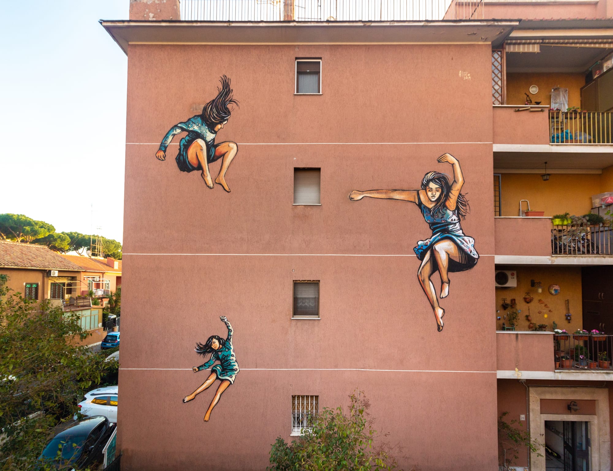 Pasquini studied at Rome’s Academy of Fine Arts. The elite nature of the university propelled her away from it and toward the streets, where she could introduce her craft to everyday people. She started small, anonymous, local. But like Rond, she was disappointed by the lack of women artists in history courses and public spaces, so she ceased to paint anonymously. Upon receiving international commissions, she began noting different reactions based on continent and culture. Contact with people became her focal point. She recalls a man confiding that he’d grown vegetables during the war on land below where she was painting, or a family inviting her inside for coffee while adorning their building’s facade. Now, Pasquini strives to humanize cities, depicting private moments for public audiences to illustrate interconnection. “The more and more I travel, the more I understand that human feelings are the same.” People just want to recognize themselves.
