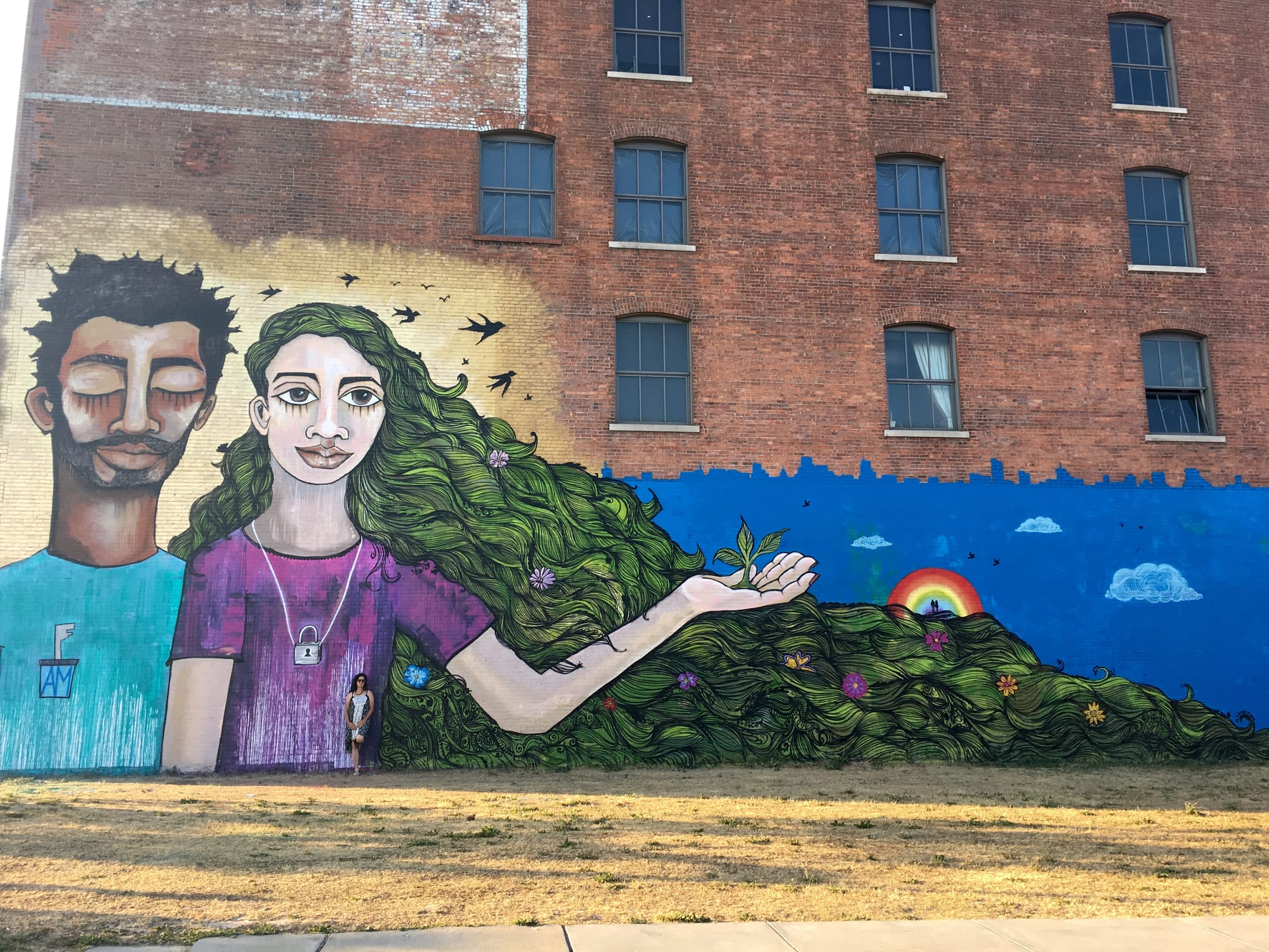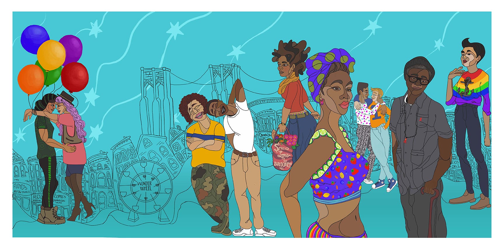 Sam Kirk paints a swirl of magenta hair below a rendering of the Brooklyn Bridge. Often collaborating with her wife, she likes to incorporate people from all walks of life into her work. She’s quick to tell me how one of her favorites (a large-scale commission in Times Square for World Pride) incorporates a diverse swath of identities: women in rainbow hijabs, nonbinary and trans folks, rare public representations of love between women of color. Working with a variety of organizations, she hopes to impart how impactful seeing oneself in a civic space can be for women of color and the LGBTQ+ community — to lead by example in being “proud to be all those things.”