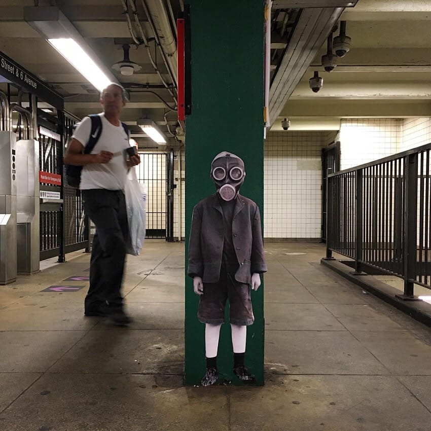 “I started this work out of a desire to contribute, and a desire for the tools of creativity to be used to make people’s lives better in tangible ways,” writes Swoon, aka Caledonia Curry, whose themes span myth, the marriage of reality and whimsy, addiction, and the sacred feminine. She’s recently pivoted toward making short films — a format in which she’s found more creative freedom than the public realm. Still, she says, “when I draw or make art, I’m peering down into the depths of myself … the kind of liminal spaces of consciousness … It’s always been my hope that some glimmer of that gets transmitted” to empower people to access their own. Echoing Pasquini, Swoon corroborates that putting up art in different countries and contexts has been eye-opening. “The place changed the work tremendously. In some neighborhoods, people were intensely hungry for art, and deeply appreciative of almost any gesture. In other places, I was viewed as a vandal and a nuisance.” What’s more, “In some places, the political climate made people fearful about what stories the work contained. In others, people felt deeply identified with and protective of the paste-ups.”