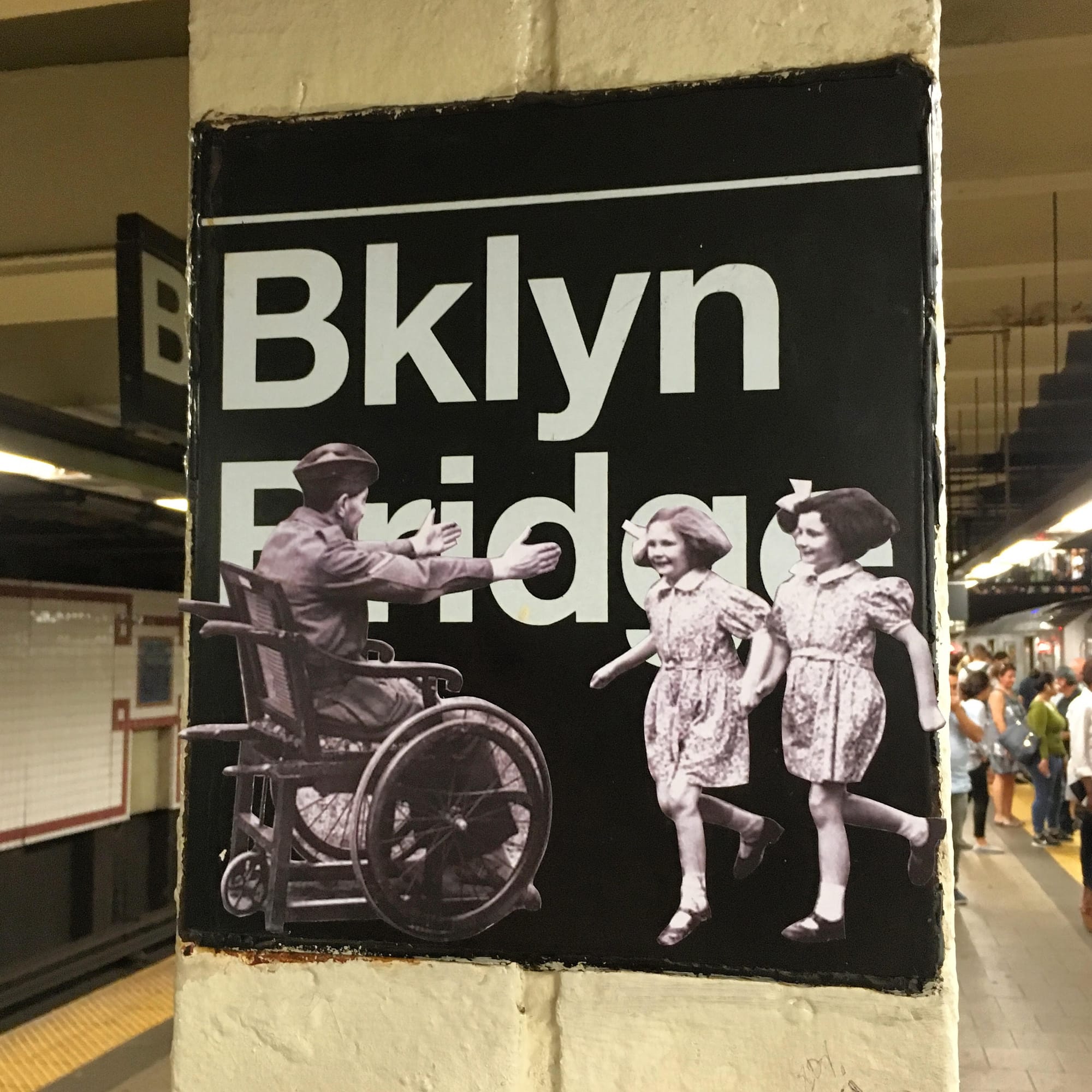 Coming from a background as a writer, Jilly B, billed as “Patron Saint of the Underground,” pastes up subway witticisms and apocalyptic WWII imagery that act as satirical critique. Although Ballistic adds that many of her works were conceived earnestly, “as a response to political news: Syrian violence, trump rolling back environmental laws, the Supreme Court deciding LGBTQ+ rights.” Her sprawling letters often even critique her own line of work. Tags such as “commodity” scribbled in gold paint beneath a crossed-out “graffiti” indict the mainstream appropriation of the form, such as how galleries charge $25 a ticket to display once-free urban works.