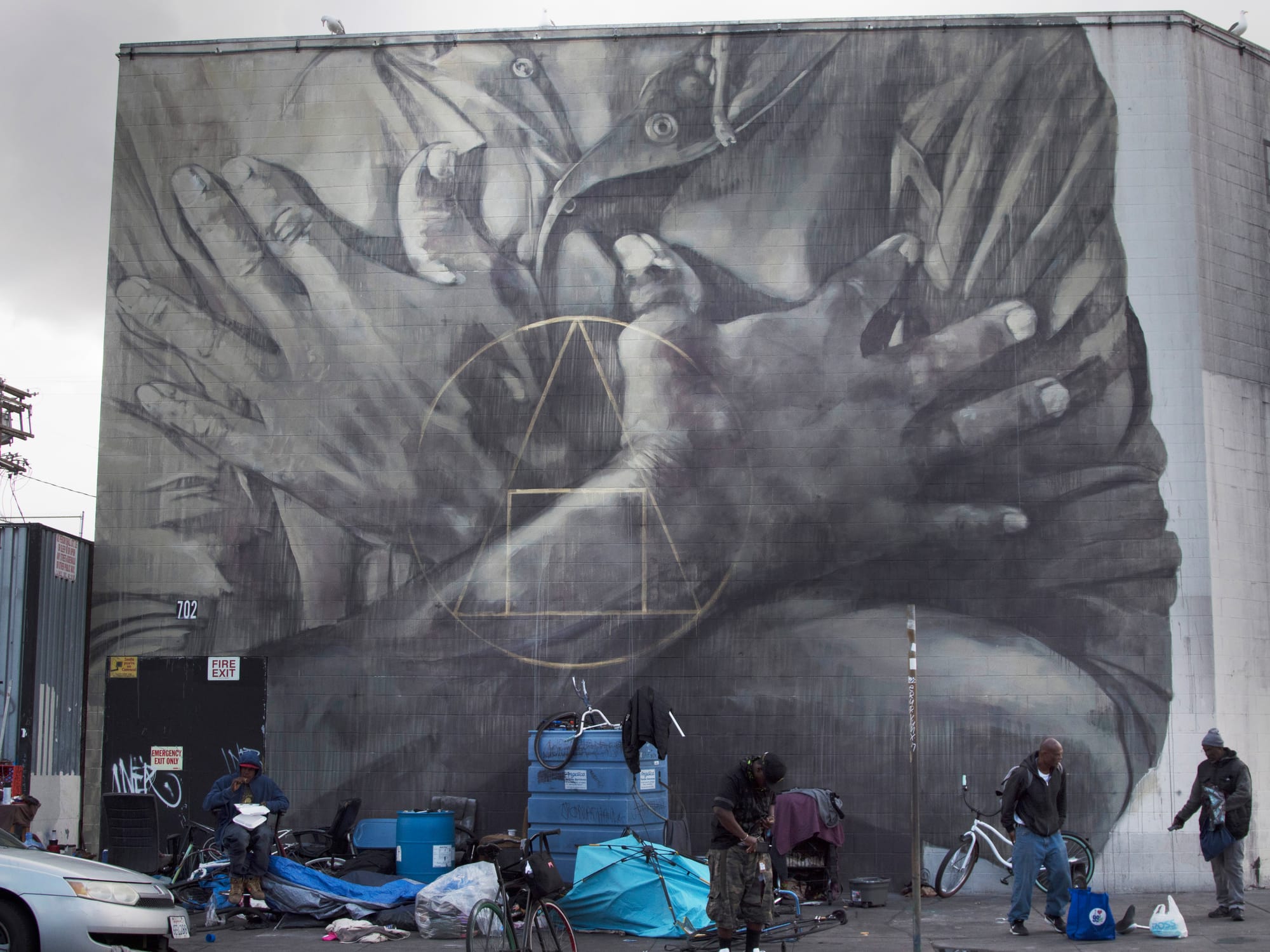 For example, Faith’s large-scale installation on Los Angeles’ Skid Row, Salus Populi Suprema Lex Esto (2018) (the name is Latin for “The welfare of the people shall be supreme law”), is a grayscale rendering of hands folded across a chest overlaid with geometric shapes. It endeavors to give “a monumental space to some of America’s most marginalized people” and serve as a “critique of the capitalistic dream, which lacks institutional empathy for non-active participants.” Yet it requires a thoughtful examination and an independent pursuit of information for viewers to ascertain the full intention.