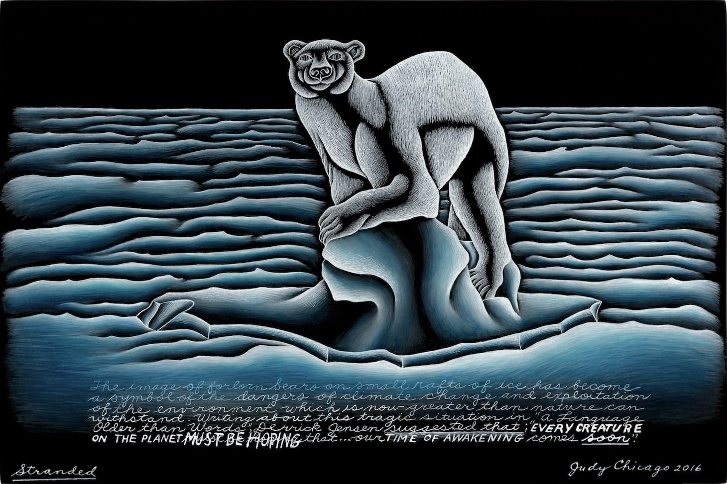 H: In addition to Judy Chicago: Los Angeles, you have two other exciting shows coming up this fall, Judy Chicago —The End: A Meditation on Death and Extinction at the National Museum of Women in the Arts (NMWA), and Picturing Extinction: Studies for the End at Salon 94 in New York. How do these three exhibits showcase the trajectory of your career? And what’s next for you?JC: Well, where I’m going next is to Los Angeles, Washington, New York, and then to Boston for the launch of the Judy Chicago Portal! [laughs] And also next May I’m having the first retrospective of my life at the De Young Museum at San Francisco. It’s amazing, isn’t it, that “The Dinner Party” premiered in San Francisco, and my first retrospective is going to be in San Francisco? And then there’s the publication of a major monograph [Judy Chicago: New Views, being published this month by the NMWA and Scala Arts Publishers]. The LA Show is the first comprehensive view of my early work, so actually my publicist Ron Longe calls the shows “from the beginning to the end,” which is funny.