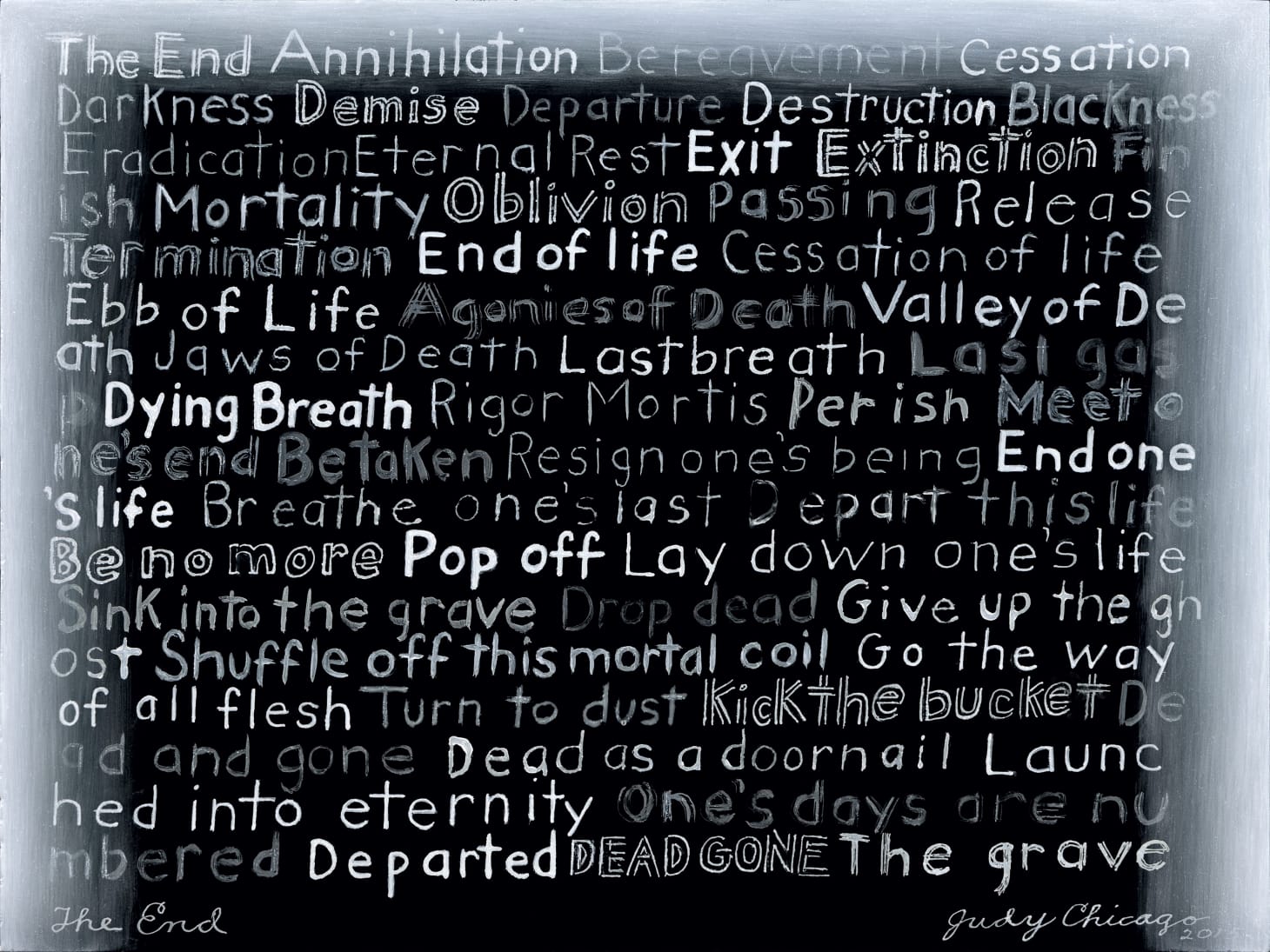 Judy Chicago: Los Angeles continues at Jeffrey Deitch (925 N Orange Drive, Los Angeles) through November 2, 2019. Judy Chicago —The End: A Meditation on Death and Extinction at the National Museum of Women in the Arts (NMWA – 1250 New York Ave NW, Washington, D.C) continues through January 20, 2020.