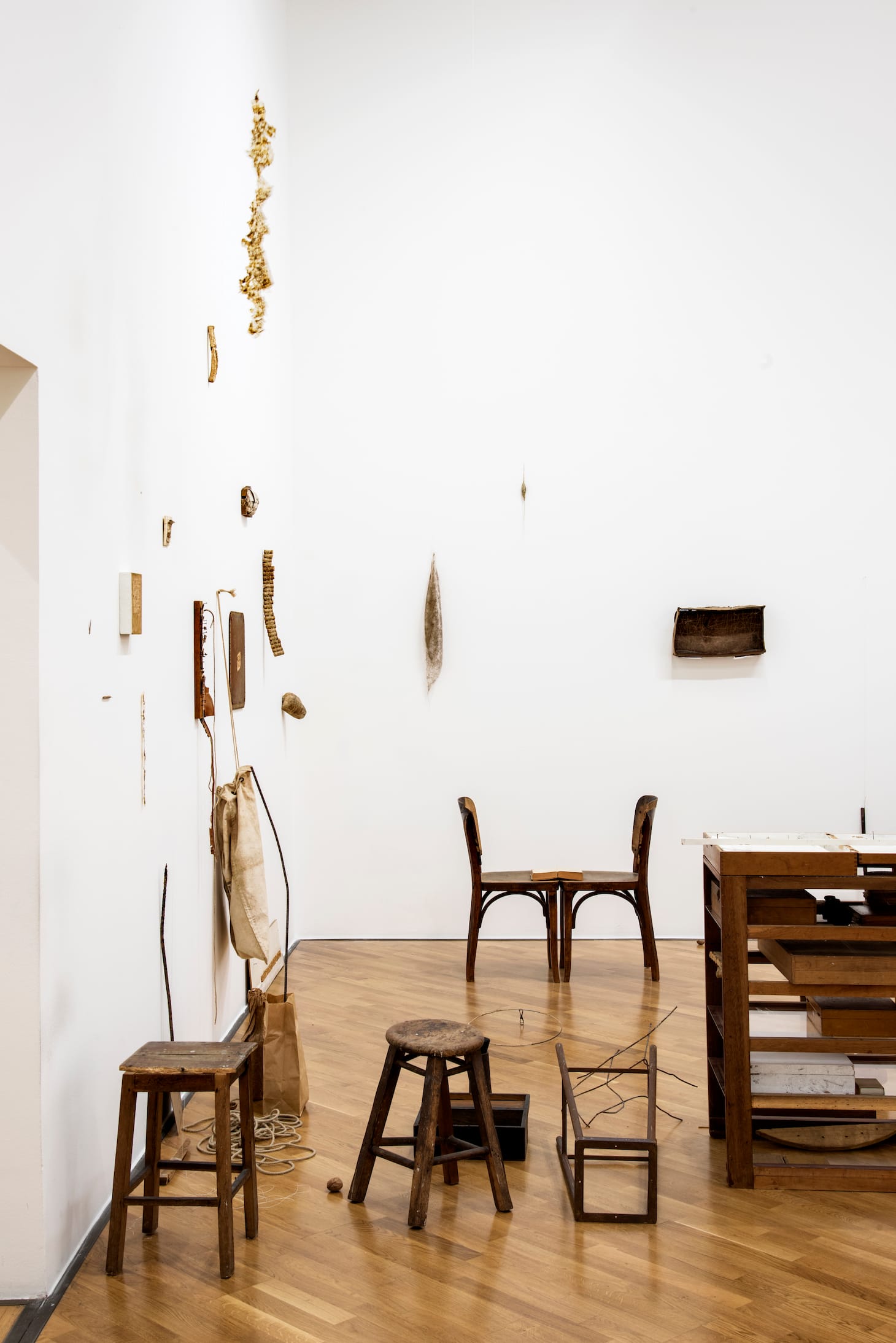 Mystery reigns over the installations, in which dozens of pieces occupy a single room. The mixing of abstract forms with common objects — such as chairs, tables, books, but also cigarettes, corks, match boxes, hair — and then with unclassifiable composites (e.g. paper bags on the floor with thin sticks jutting out of them, other pieces of paper swaying from the ceiling), creates an atmosphere of a surreal domestic space, or a workshop. In one room, the configuration of various pieces feels as if Alberto Giacometti’s miniature sculpture “The Palace at 4 a.m.” (1932) were blown up to real-life proportions — with the same frugality of conception, but also whimsy. Even though, unlike Giacometti, Gomes doesn’t hint at figuration, her universe conveys a consistent residue of human presence — the creator is felt through her creations.
