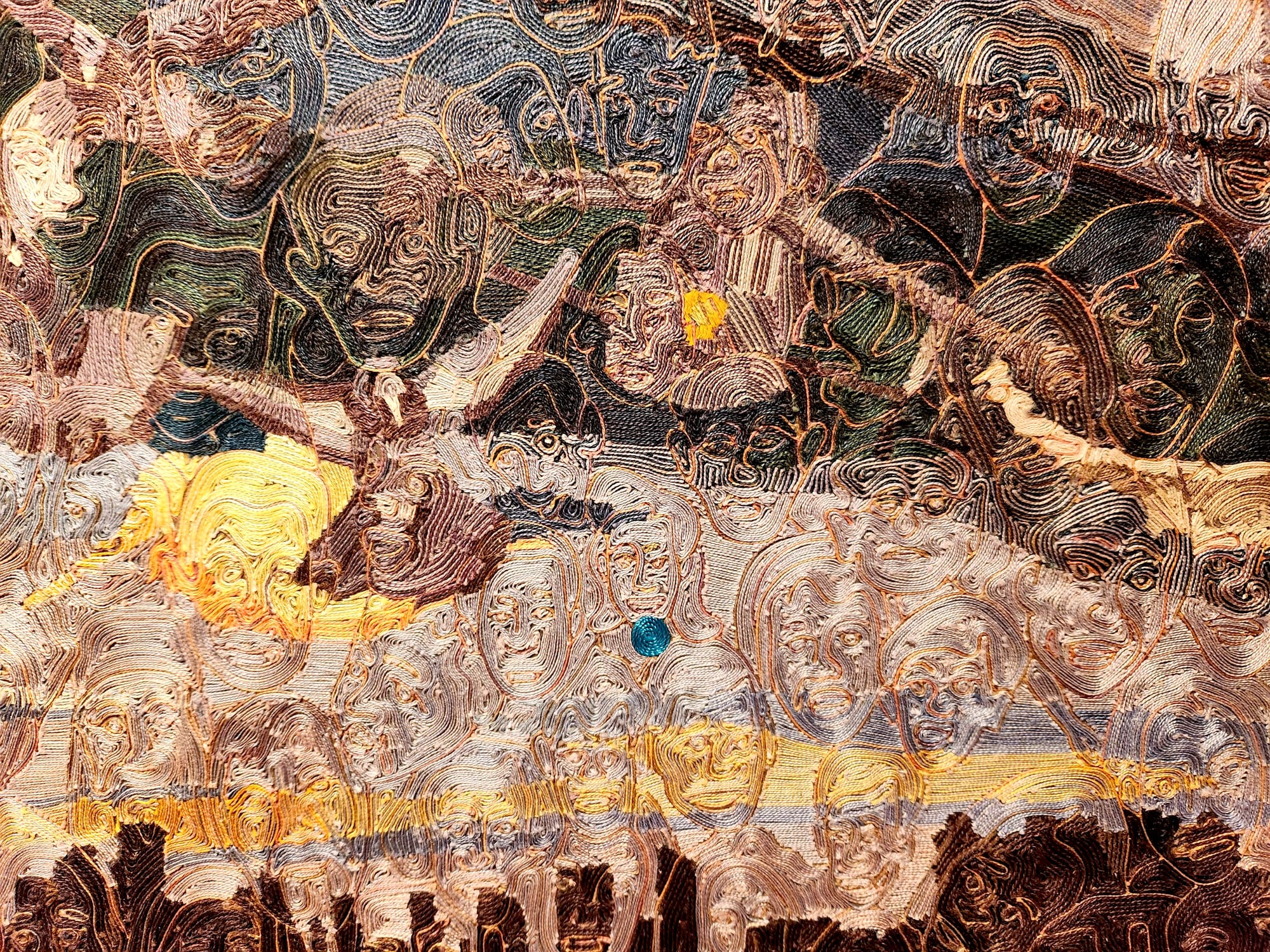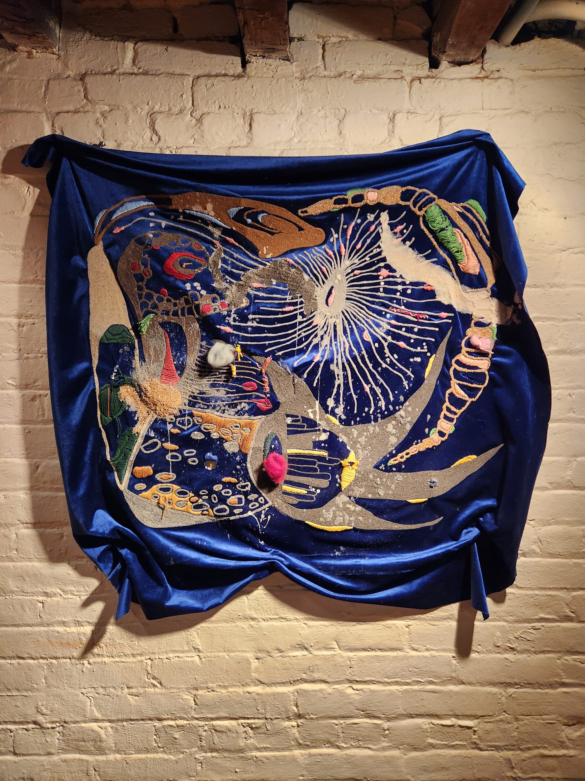 The exhibition takes up every floor of the 18th-century building it's situated in, from dedicated displays of Ray Materson's bite-sized embroidery compositions to enormous, site-specific installations like that of Melissa Webb. I'm a paint-on-paper person myself, and the extent of my "fiber art foray" was some amateur (read: bad) embroidery on canvas followed by a months-long tussle with a barely functional sewing machine, so I found The Golden Thread particularly exciting in how so many artists blew past boundaries of tradition and utility as they reinvent the medium.