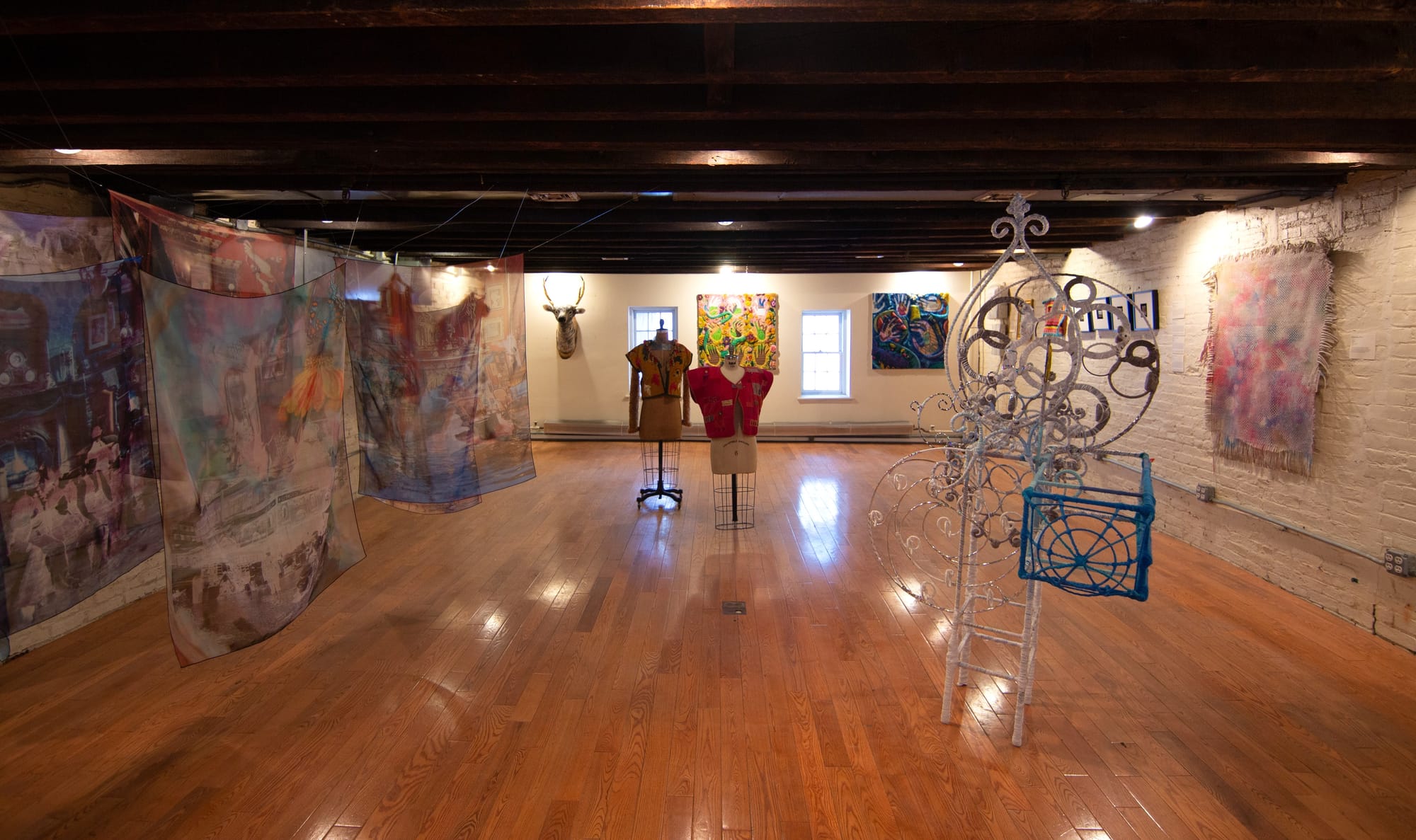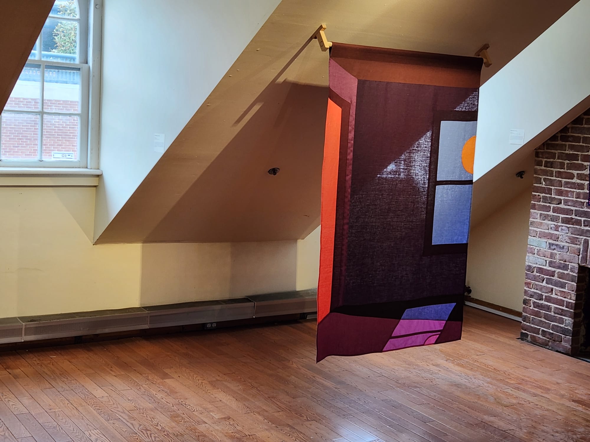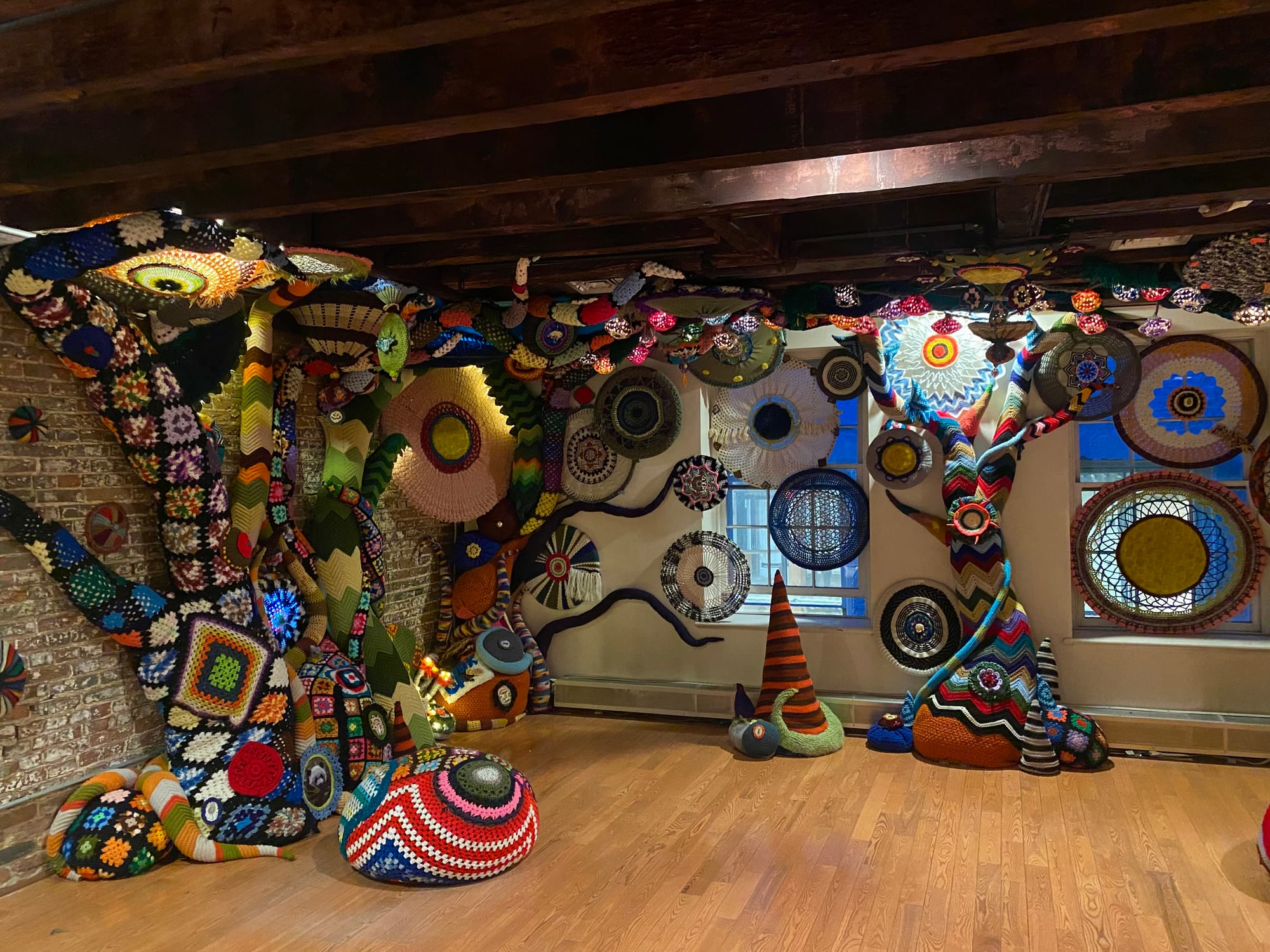 As the exhibition ascends from floor to floor, the featured works become more and more disparate — connected by medium alone, and barely at that. Such variety has its advantages and disadvantages as the show contorts throughout the old mercantile storage building of red brick walls, exposed wood fixtures, an enormous turning wheel, and several precariously narrow and steep staircases. And yet, the space and the concept lean into each other pretty poetically, considering that a show about the present and future of fiber art exists in a formerly industrial site that has had to reinvent itself as the city's needs evolve.