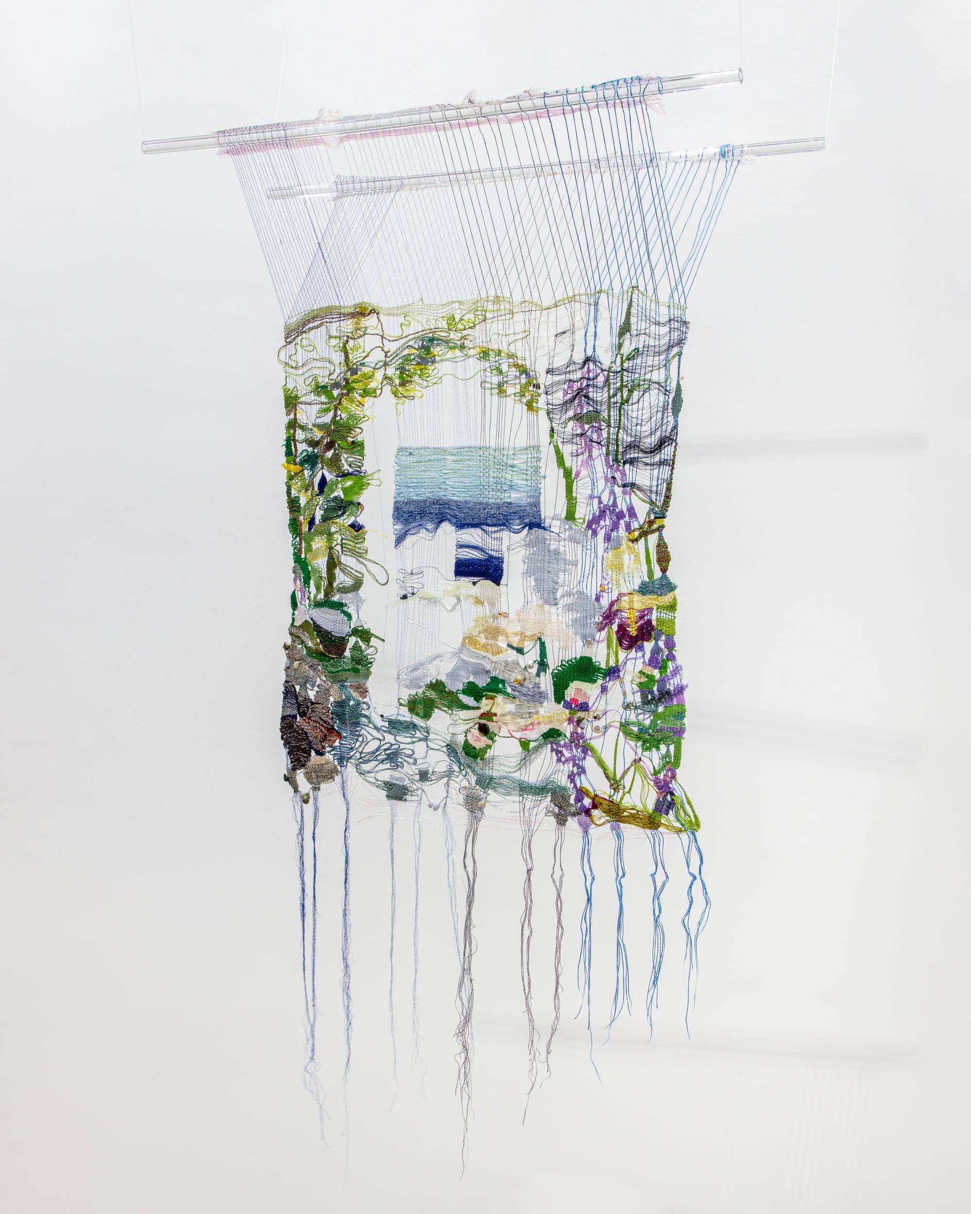 The first floor is equal parts inviting and thought-provoking with Jeila Gueramian's immersive installation "It Reminds Me of You" (2024), rife with easter eggs throughout, and Jacqueline Qiu's delicate handwoven tapestries, suspended in mid-air and created with obvious devotion to both negative space and fine details. Adjacent to Qiu's work and contrasting in both scale and form, Meg Lipke's plushy "Garden Gates II" (2019) leans up against a white wall, gently commanding attention.