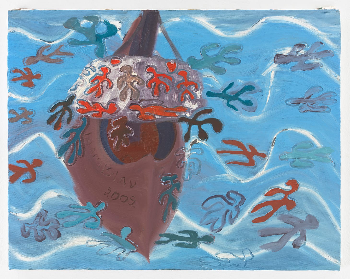 Ghebreyesus’s paintings nod to a plurality of experiences. Oceanic migration narratives are central — the artist himself fled his home country of Eritrea amid war, and references to the 19th-century Amistad ship captives, who freed themselves from their chains, abound. Emblematic of loss and revolution, such aquatic motifs also represent the quotidian ways in which communities sustain themselves through fishing and other maritime activities.