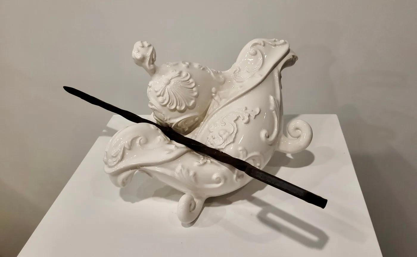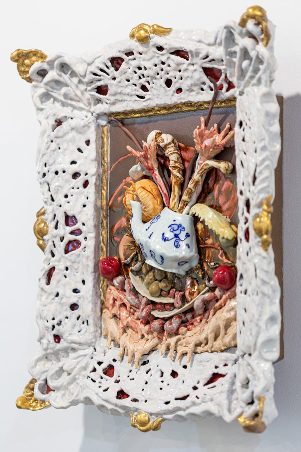 Standouts in terms of virtuosity include Dirk Staschke, who explores the genre of Dutch still life painting through wildly amalgamated ceramic works that combine porcelain, earthenware, and found pottery fragments into deceptively cohesive “paintings,” often surrounded by elaborate ceramic frames. The results are so immaculate that it might take an experienced potter to understand how difficult the effect is to achieve. The same can be said of a series of works by Laurent Craste, which feature traditional French porcelain vessels withstanding various abuses by metal implements. Different clays fire at different temperatures, and experience varying levels of shrinkage; the ability to master enough elements to combine them into balanced finished works is a great accomplishment. Likewise, one might be distracted by the ornate surface finishes on large vessels by Marissa Alexander, and miss the payoff she achieves by risking an incredibly thick coil and slab construction technique.