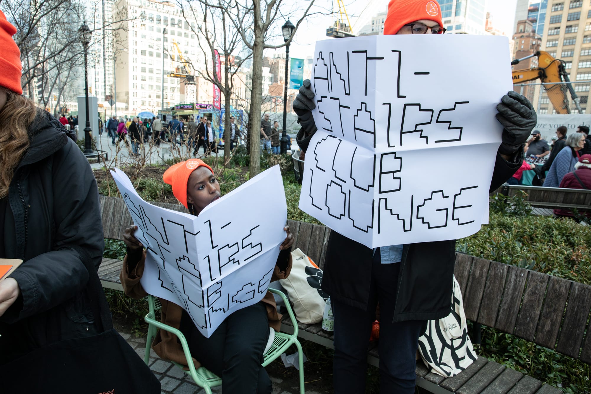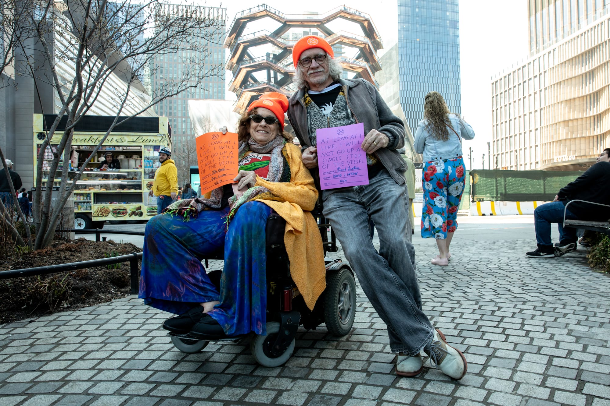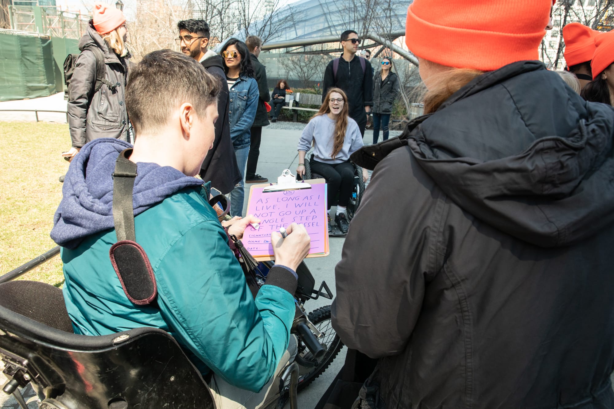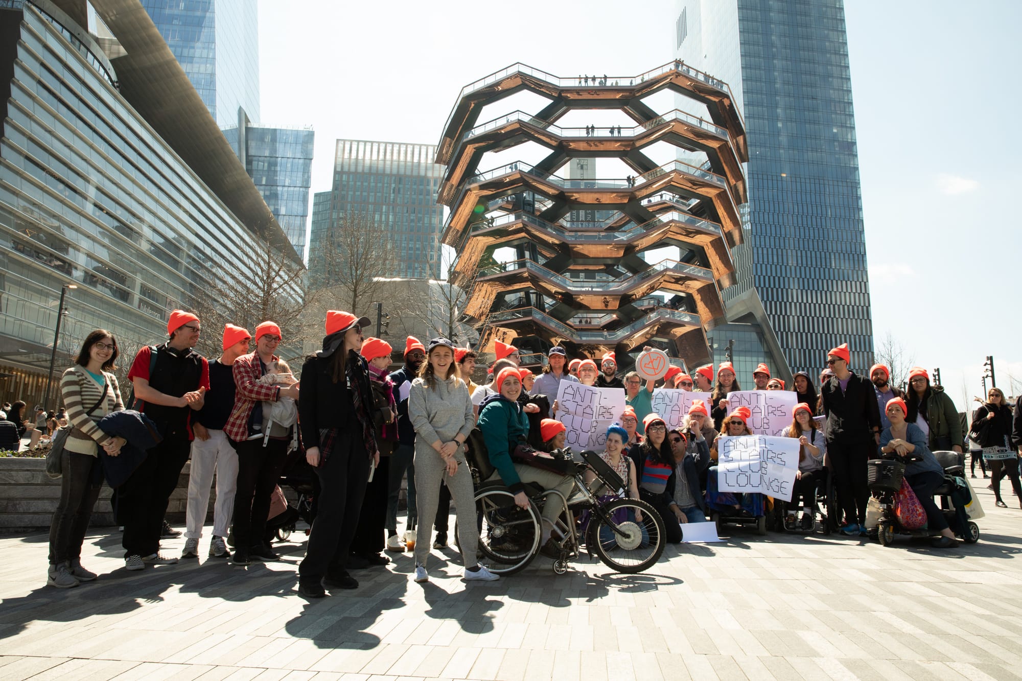 In April of this year, Shannon Finnegan and her Anti-Stairs Club Lounge organized a demonstration of disabled and non-disabled individuals to protest Vessel at Hudson Yards. “While Vessel does have what is touted as an ‘ADA-compliant’ elevator, the elevator is not an equitable means to experience the structure,” Finnegan told me in an email. The Vessel’s website notes that the elevator is available to individuals who have a disability — which means that parents with strollers, individuals with invisible disabilities (those disabilities that are not obvious when looking at people), and even tourists with suitcases will have a hard time accessing the structure. “From its inception, Vessel has centered the experience of climbing stairs and imagines a public without people unable, unwilling, or uninterested in climbing stairs,” Finnegan added. The protest included the circulation of waivers in which individuals asserted that they would never in their lives ascend a single step of Vessel.