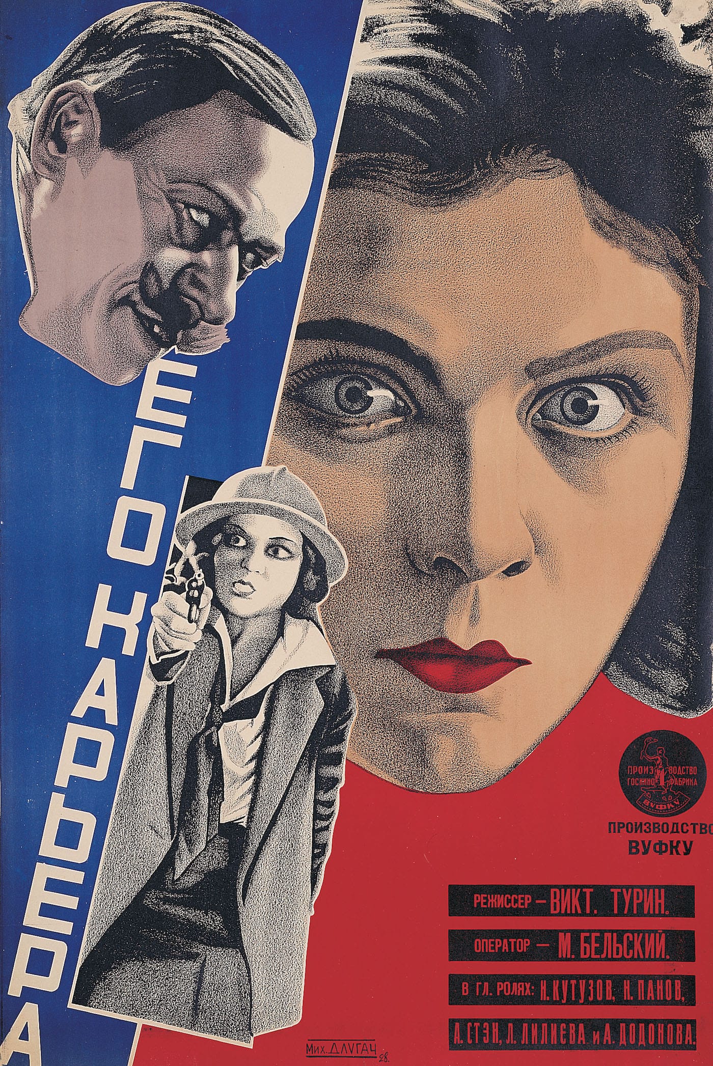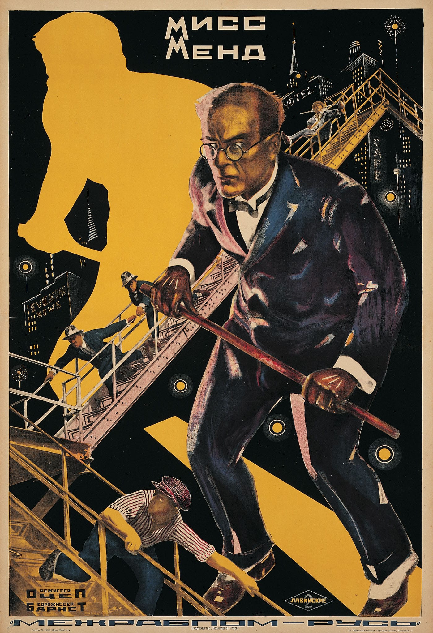 Significantly, these posters were all made before Soviet realism became the dominant art form under Stalin, and there was a fluidity and freedom in styles. Part of what fueled this were the diverse backgrounds of the poster artists, such as the prolific brothers Georgii and Vladimir Stenberg who came from set design and Constructivist sculpture (and together made around 300 posters), and Alexander Rodchenko who worked in photography and industrial design. Their experimentation is especially remarkable considering the speed at which these posters were printed. Pack notes that two artists — Vladimir Stenberg and Mikhail Dlugach — “recalled that it was not unusual for them to see a film at three o’clock in the afternoon and be required to present the completed poster by ten o’clock the next morning.” To make their job even more stressful, many of the printing presses were in chronic disrepair, as they predated the 1917 Revolution.