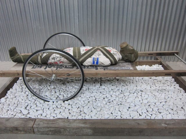 Unlike his well-known photographs that capture a striking starkness in natural history dioramas, empty American movie palaces, and the sharp horizon where the ocean meets the sky, the exhibition is all clutter and chaos. Corrugated metal worn with rust makes up the walls where there isn’t exposed brick, treasures and trash from Sugimoto’s own collection are crowded in glass cases and meandering rooms, and if you enter the exhibition after sunset you are given a flashlight. No fixed electric lights are used, some of a skylight has even been crashed open by a supposed meteor. And everywhere, the world has just ended.