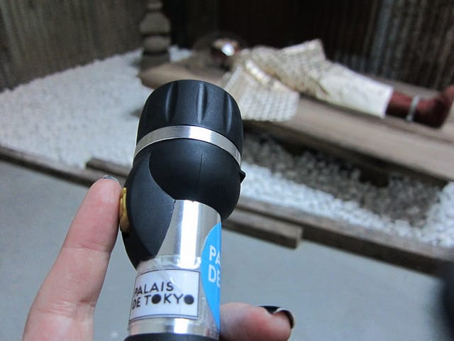 It’s a highly enjoyable experience, albeit frustrating if you’re the cohesive type, as there’s no way to grasp every detail of the large-scale installation in one go. My first walk through the exhibition I was exhausted by the exhibition texts (in both French and English) written “in a trembling handwriting,” and then later as the sun set my museum-issued flashlight only cast the weaving cursive in a yellow glow difficult to decipher. Yet the wandering in Sugimoto’s ruin reminded me of real abandoned spaces I’ve entered, where you find these little scraps of the people who have departed to decipher imperfectly what made them leave. Here the voice of a “comparative religion scholar” who perished in the wake of a meteorite is alongside a wine bottle below Sugimoto’s photographs of the “Last Supper” at Madame Tussauds, streaked by the Hurricane Sandy floods. A note from a “contemporary artist” is next to a row of empty Campbell soup cans “aged on the balcony of the artist’s studio,” representing a devastating Warhol market crash, and a 13th century statue of Raijin the thunder-god cavorts before Sugimoto’s 2009 lightning field photographs.