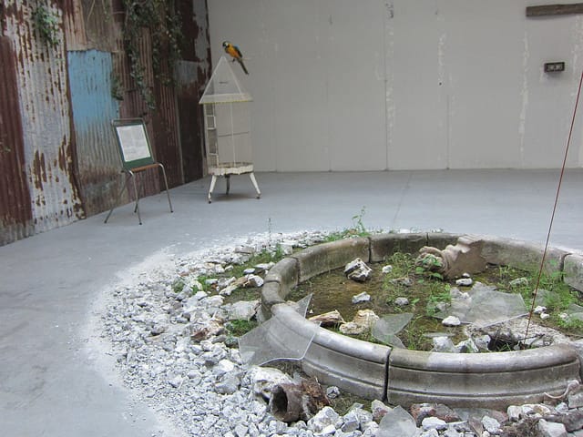 Then there is the taxidermy parrot that wails out creepy music and a croak of “Aujourd’hui, le monde est mort” (“Today, the world has died”) and “Such a wonderful feeling I’m dying” when you approach, a mummified mannequin representing a beautiful sci-fi hermaphrodite race of the future, a casket lift holding a giant phallic object, and a Duchamp-inspired Japanese sex doll posed before a photograph of a forest, as if you’ve been brought through the keyhole of that unsettling installation and found in the end it is much less illicit but just as upsetting.