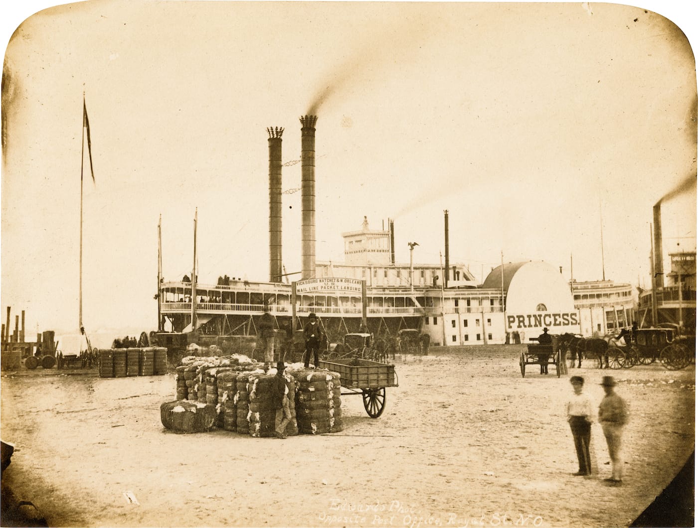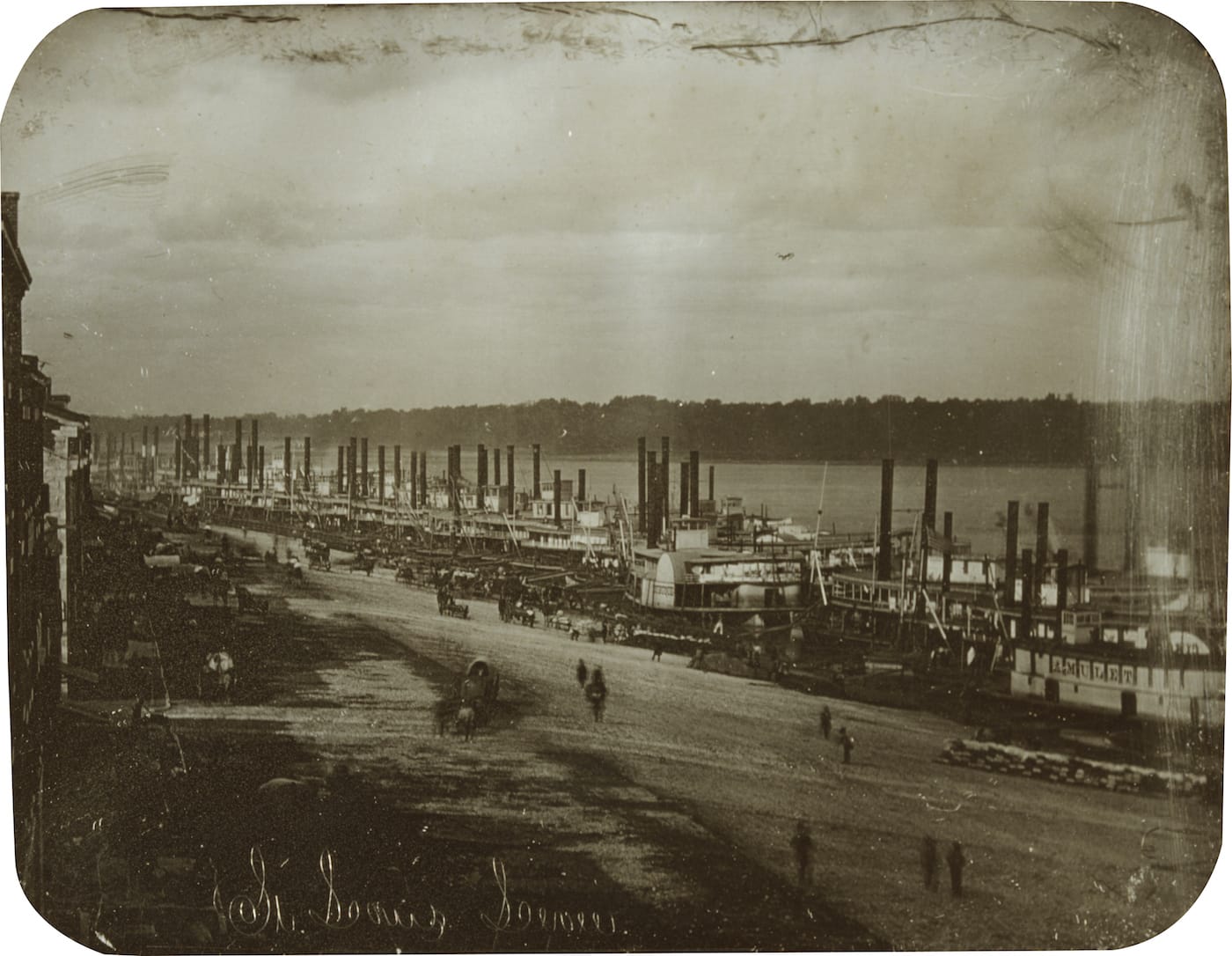 While the promise of western expansion was expressed in landscape photographs of Yosemite or the Great Plains (which frequently omitted any indigenous people living there), eastern landscape photographs of the time showcased how Americans were already adapting to the country’s “wild” topography through industry and urbanization. A horde of steamships gathers at the St. Louis levee in Thomas M. Easterly’s 1852 daguerreotype of the rapidly expanding city; railroad tracks cut through a forest of towering trees in James F. Ryder’s 1862 albumen prints for the Atlantic & Great Western Railway.
