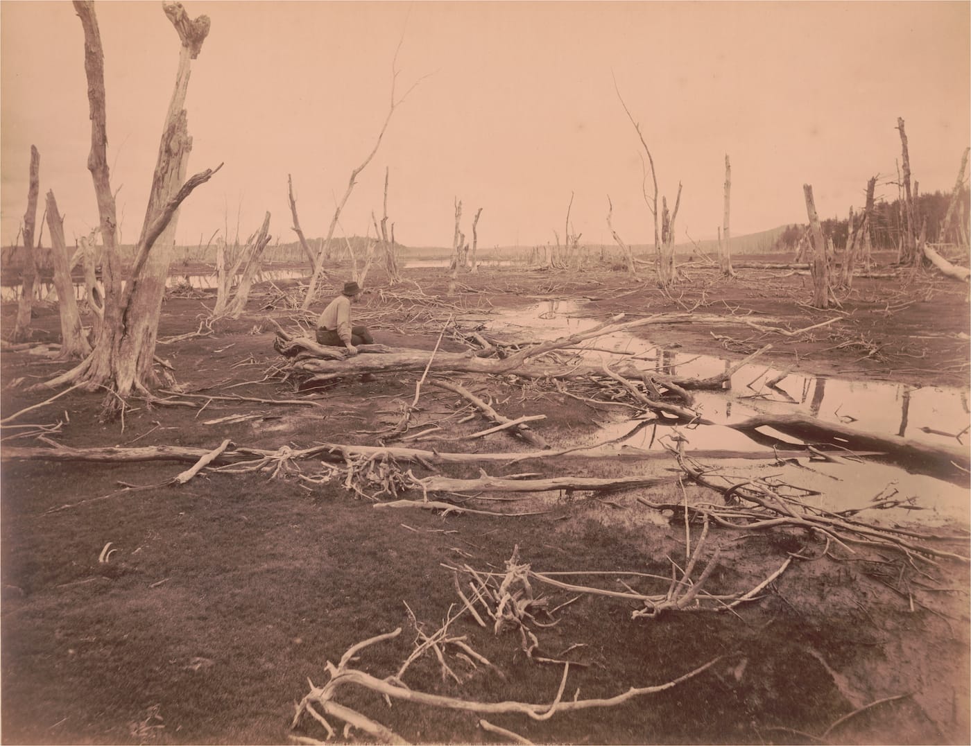 As the decades went on, coal, tanneries, mills, canals, and railroads caused increasingly radical changes to the land. The Civil War carved its own ecological scars, as seen in Andrew J. Russell’s photographs of rifle pits and other military infrastructure in Virginia. Landscape photography in the latter half of the 19th century became more dire than optimistic.